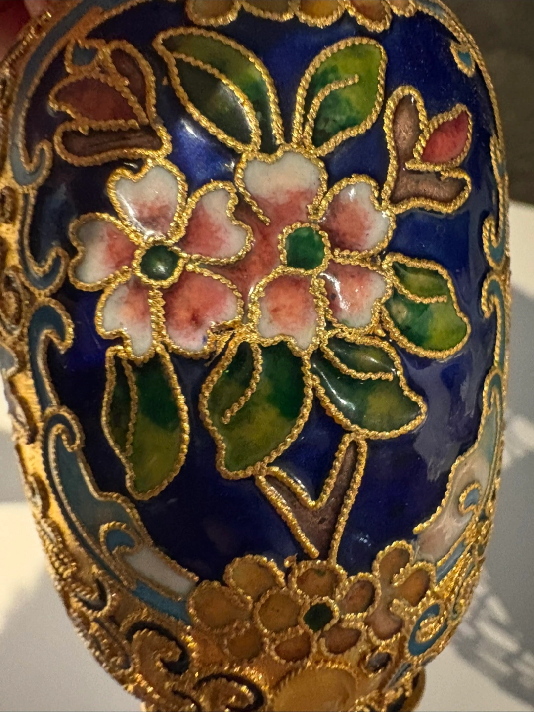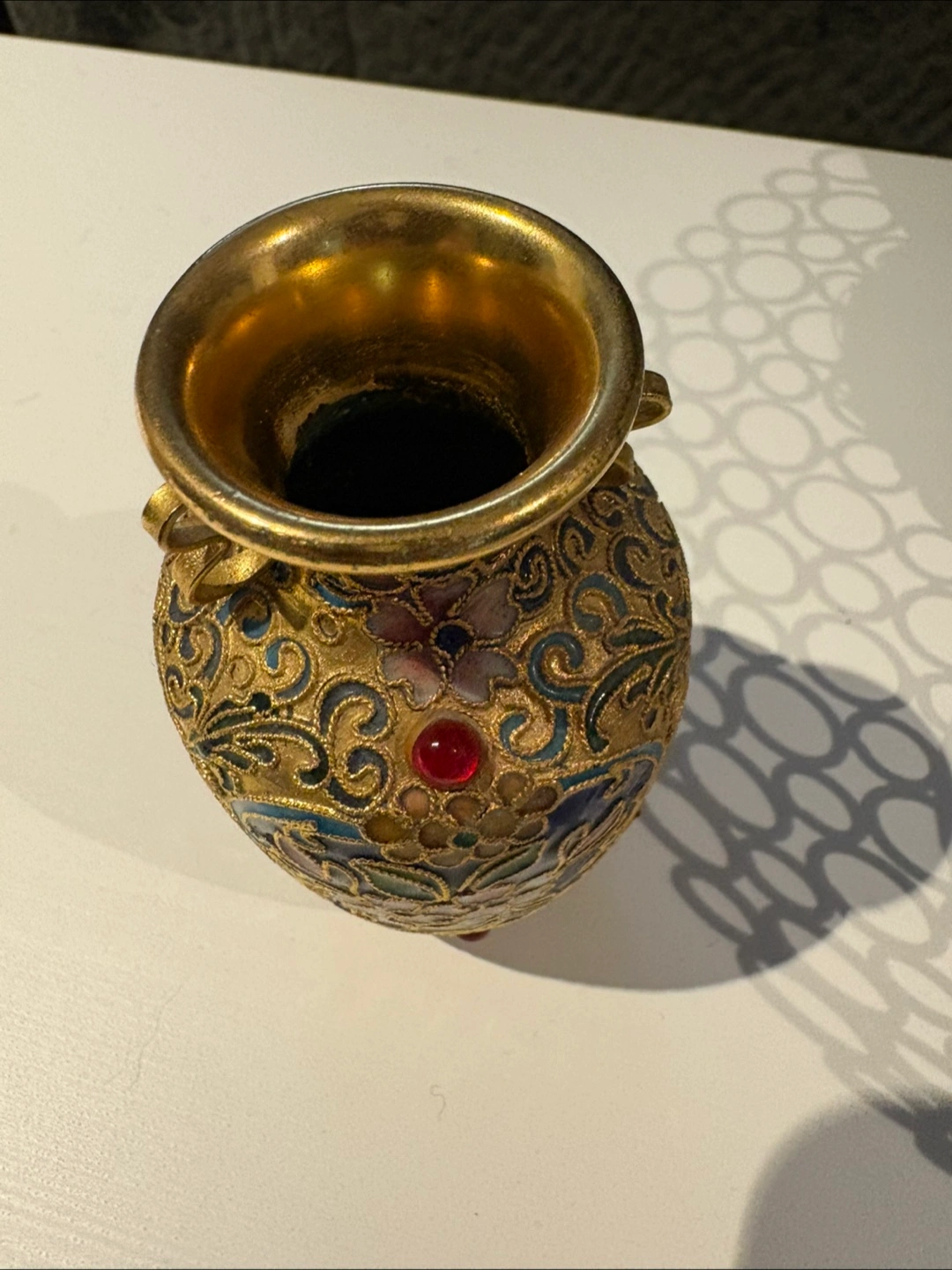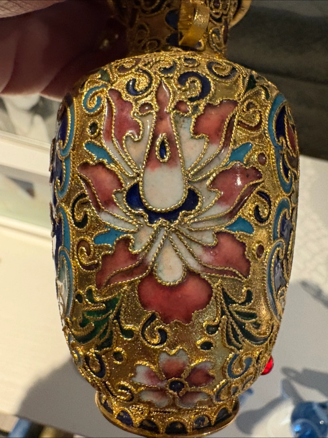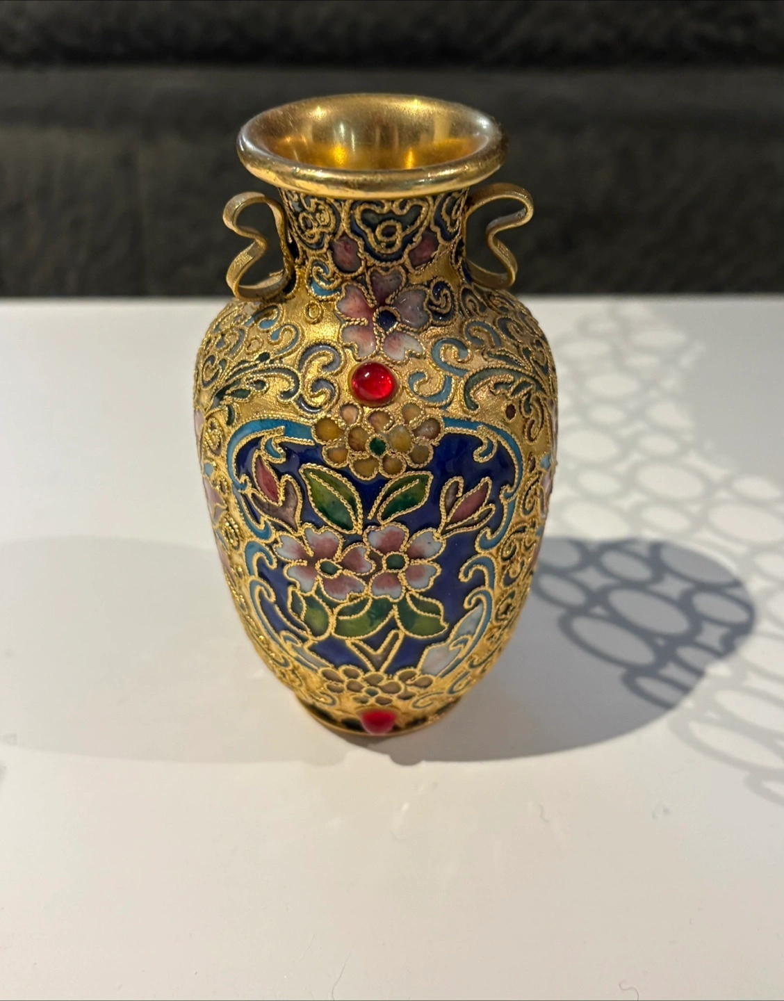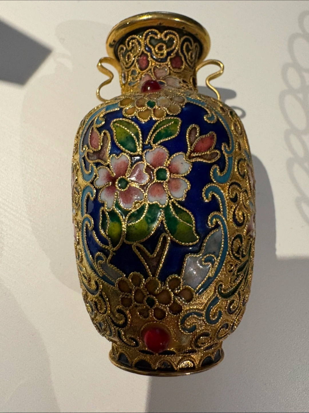 Selling a beautiful vintage cloisonné vase. It features intricate floral designs with gold detailing and vibrant colours. It would make a lovely addition to any home!