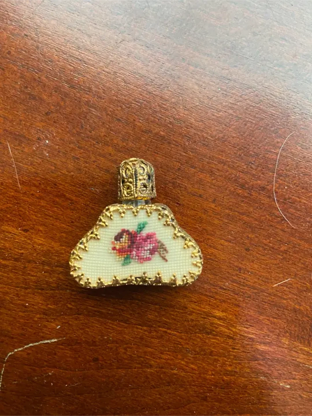 Selling a cute vintage miniature perfume bottle! It has a delicate design with gold trim and a decorative cap. Perfect for collectors or anyone who loves unique vintage pieces. Amazing heart shaped piece Very rare Beautiful embroidery Gold trim Clear back