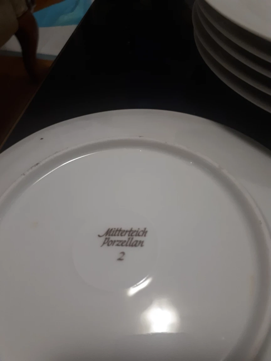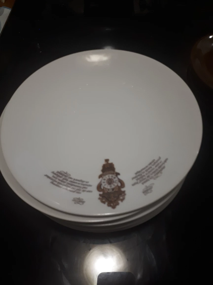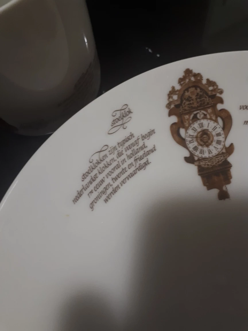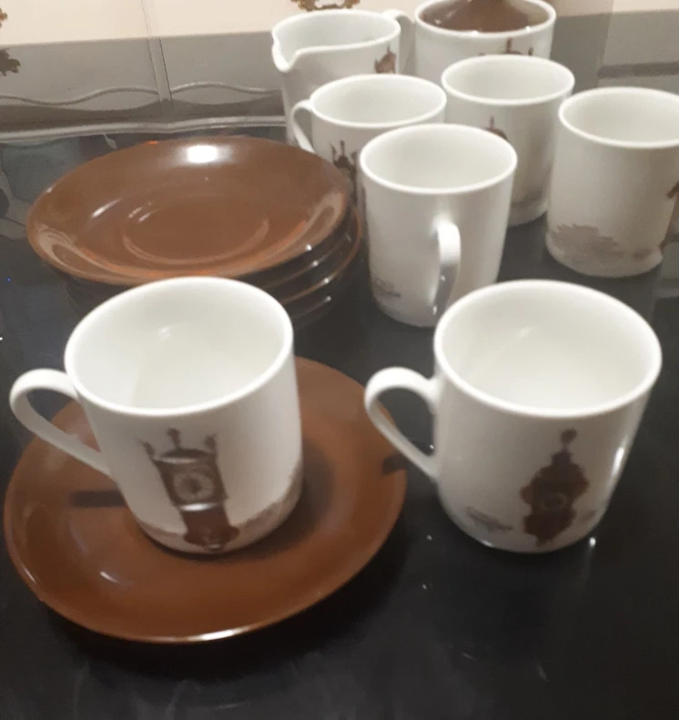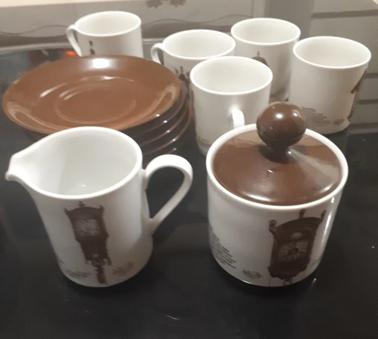 1000+Tea set includes 6 cups and saucers, creamer, sugar bowl, and 6 larger plates. All pieces feature a brown clock design.