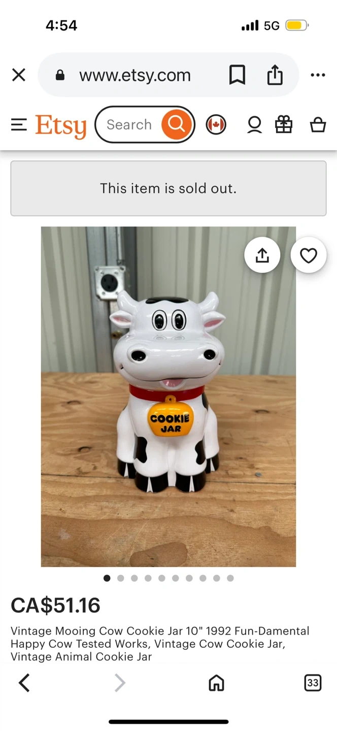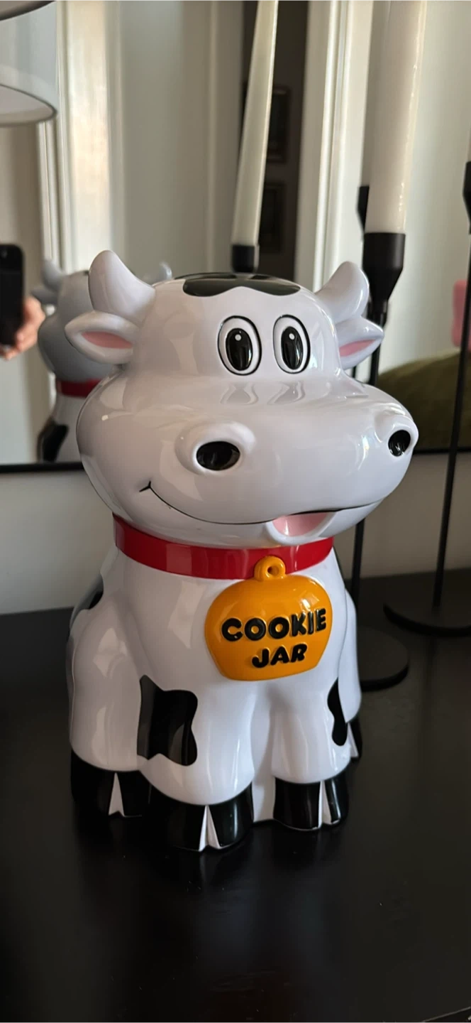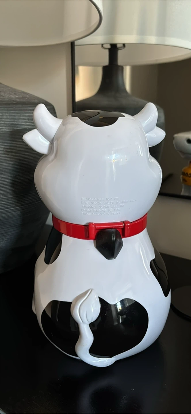 82Selling a vintage mooing cow cookie jar by Fun-Damental! It's a charming piece with a cute cow design. This cookie jar is 10" tall and features a red collar and a tag that says 'COOKIE JAR'. It's in great condition and would make a delightful addition to any kitchen or collection
