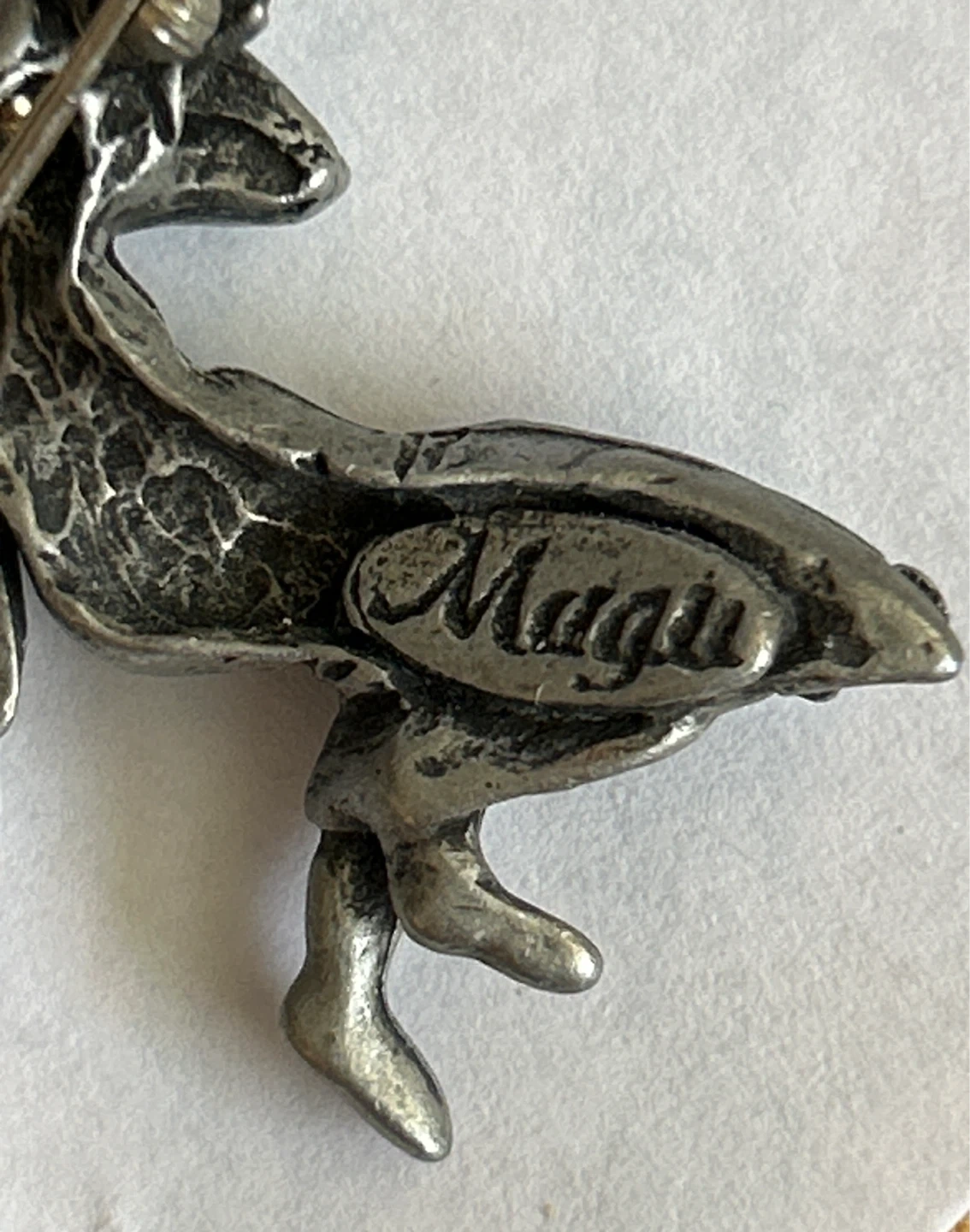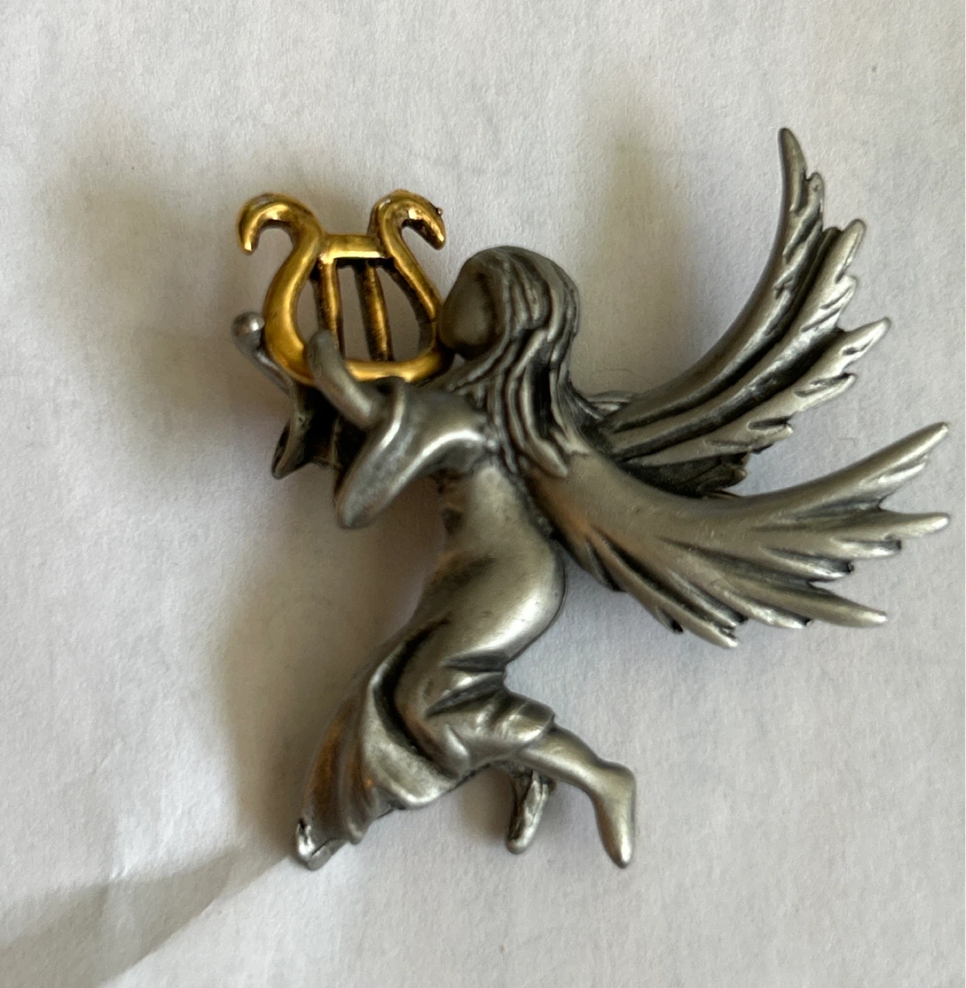 Selling a vintage brooch that features an angel playing a harp. The brooch is silver in colour with gold accents on the harp. It's marked with the name 'Mugu'. It is a beautiful piece and has a good quality. View all photos provided. Smoke/Pet free home. Cash & Pick Up only.