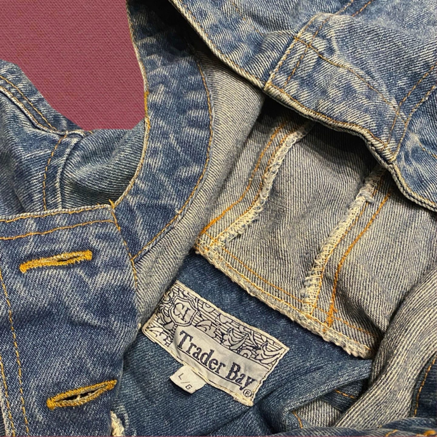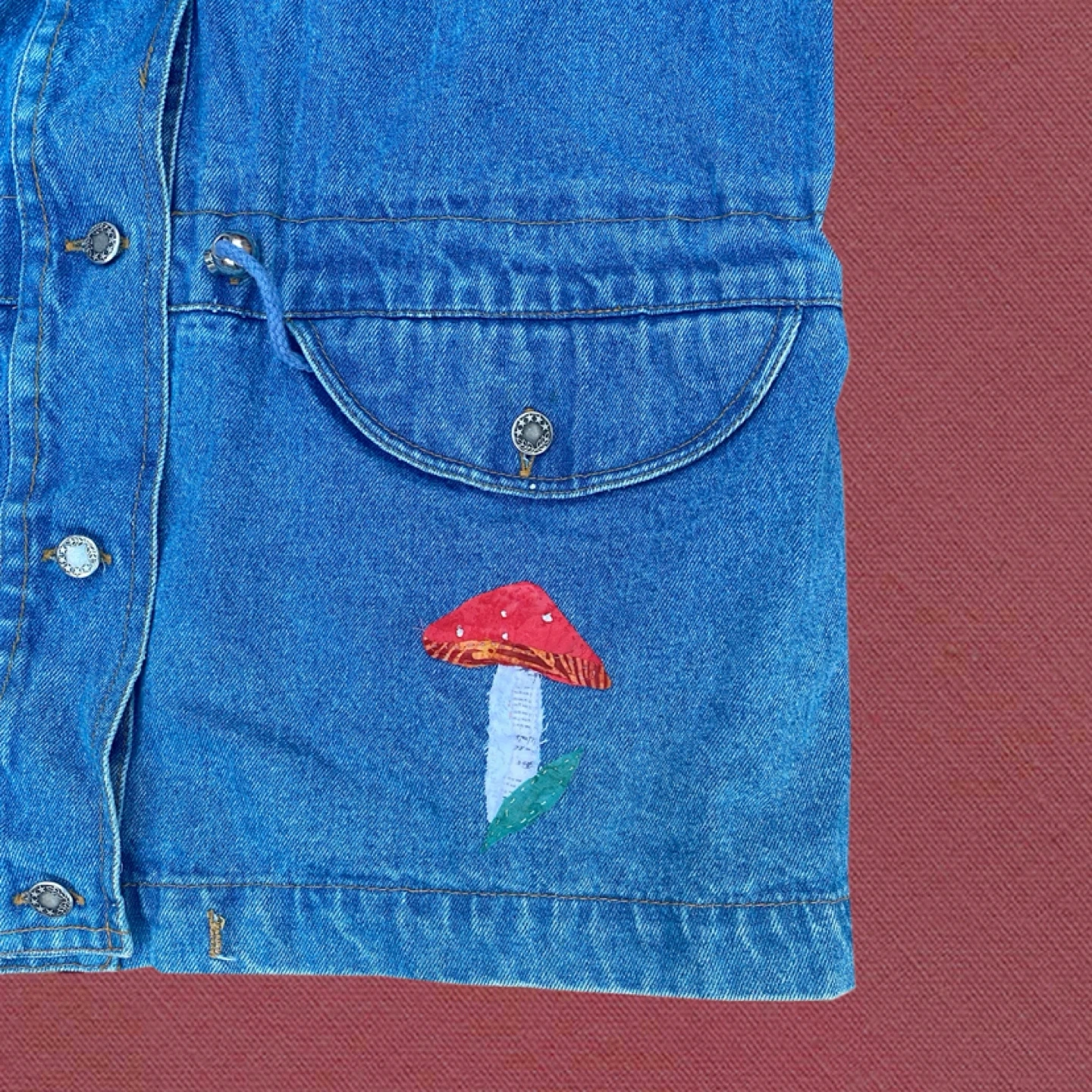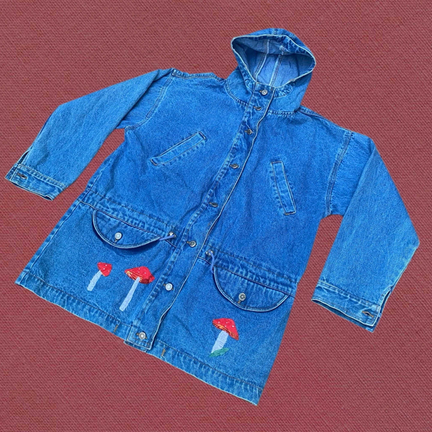 96Vintage Trader Bay denim chore coat. Size large but fits oversized. Has big pockets and drawstring waist. Mushrooms are hand stitched, probably best to wear and wash gently. Pick up near Runnymede and Dundas.