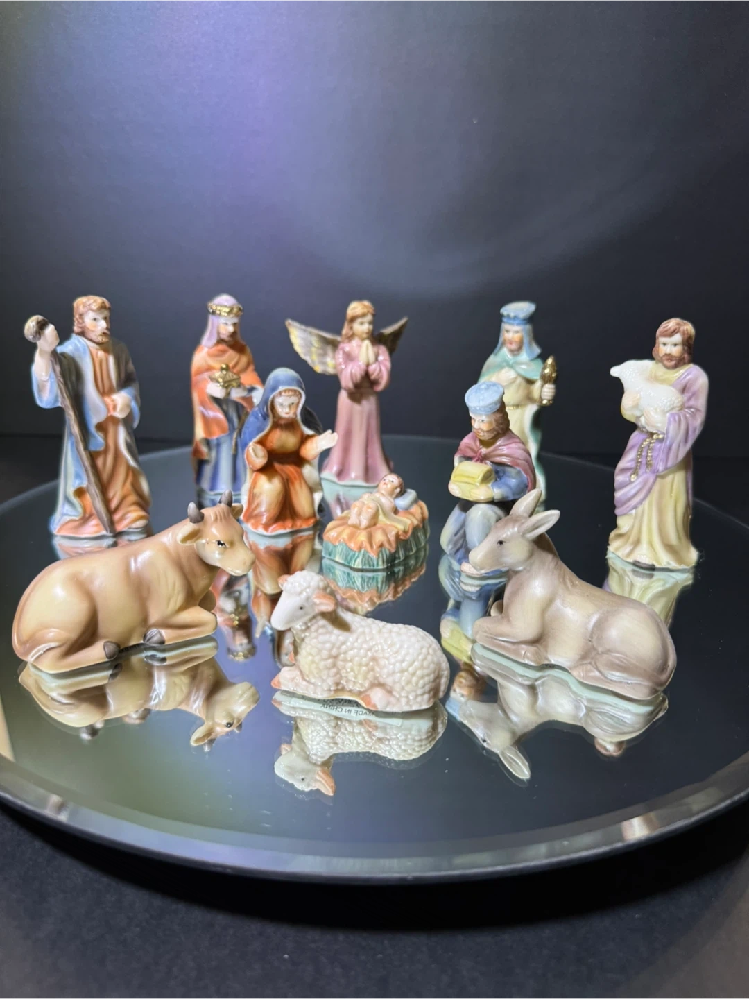 60Selling a vintage nativity set. It includes figurines of Mary, Joseph, baby Jesus, the three wise men, an angel, a shepherd, a cow, a donkey, and a sheep. Perfect for the holidays!