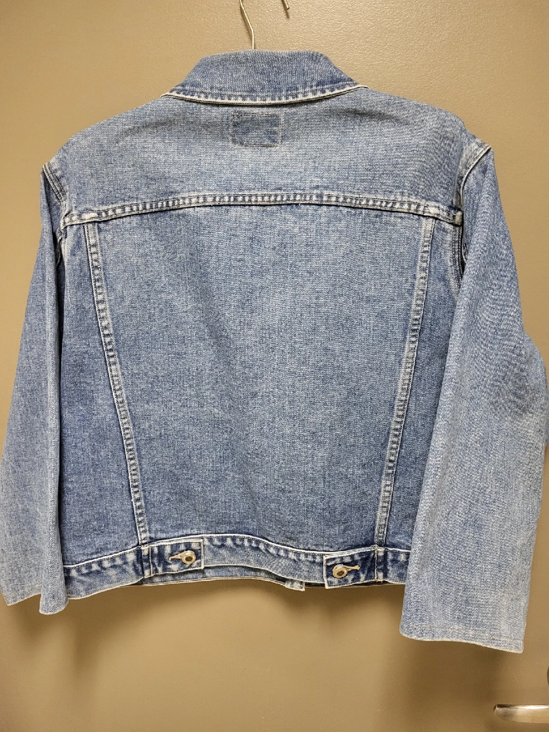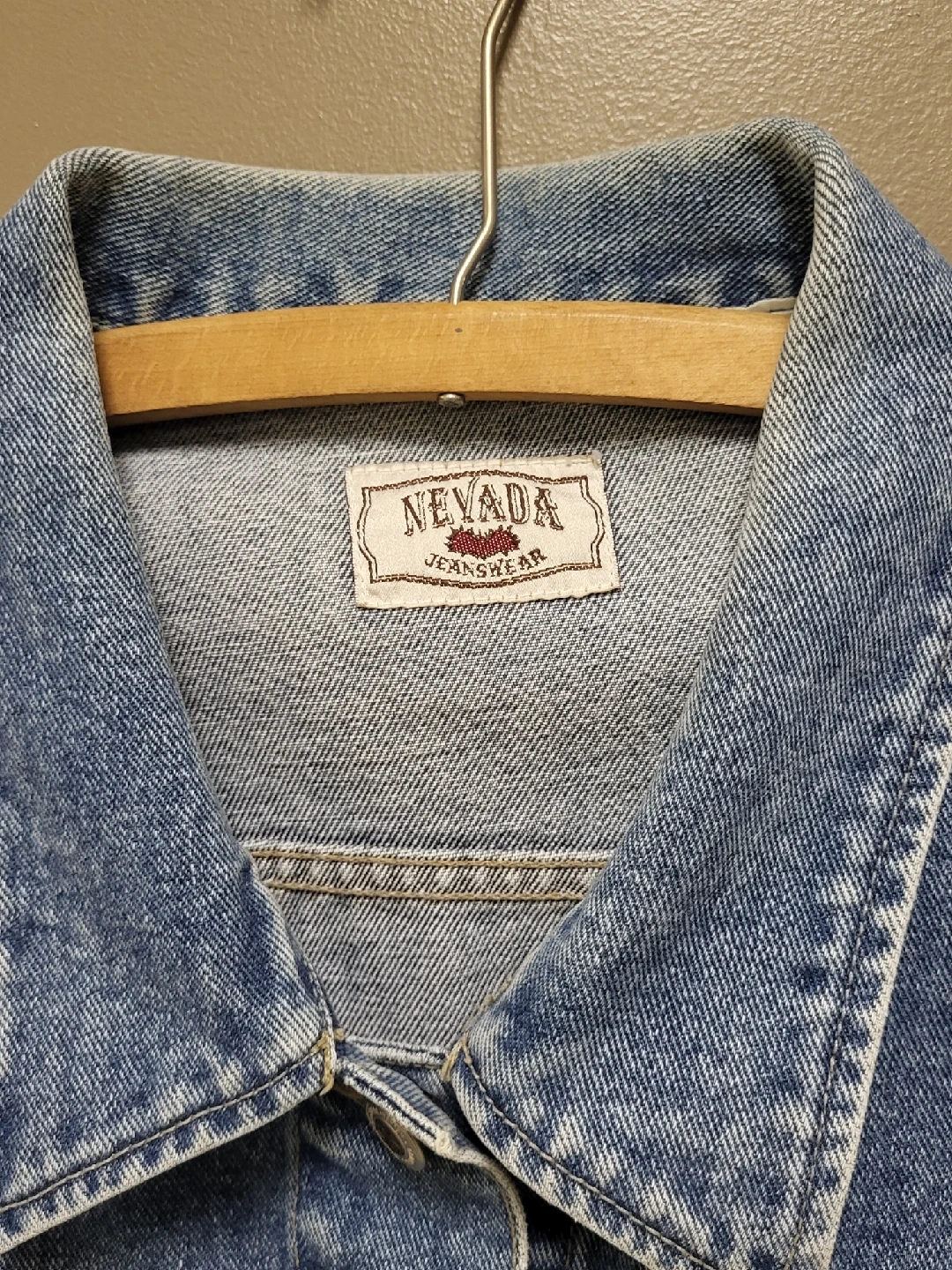 1000+🛍️ Vintage Nevada Jeanswear Cropped Denim Jacket Price: $65 CAD (or $50 USD) ✨ Product Description This is an authentic Vintage Nevada Jeanswear denim jacket, likely from the late 80s or 90s. It features a classic, medium-blue wash and a popular cropped length that makes it perfect for layering over dresses, high-waisted skirts, or jeans. Brand: Nevada Jeanswear Era: Vintage (Estimated 1990s) Style: Cropped Denim Jacket Color: Medium Wash Blue Denim Details: Button-front closure, classic collar, two front flap pockets with buttons. Condition: Excellent vintage condition. Minimal signs of wear consistent with age, great fading. 📏 Detailed Measurements (Please note that vintage sizing can differ, so please rely on the measurements below for the best fit.) Shoulder (seam to seam): 17 inches Chest (pit to pit, doubled): 42 inches (21 inches flat) Sleeve (from shoulder seam): 19 inches Length (from back of collar seam): 23 inches