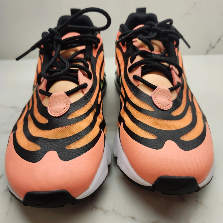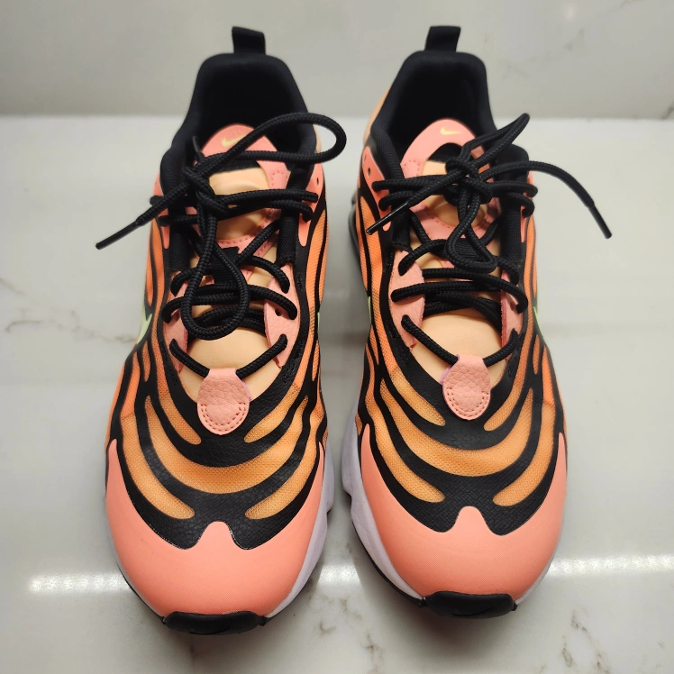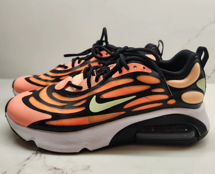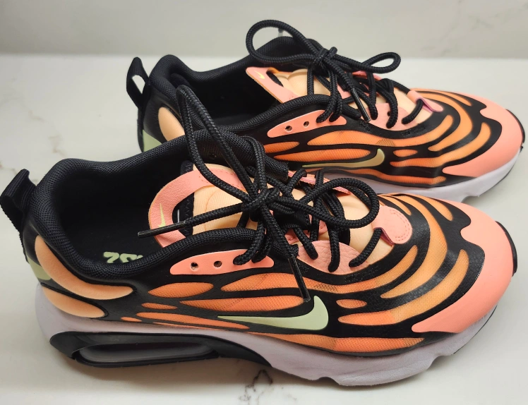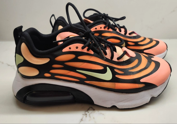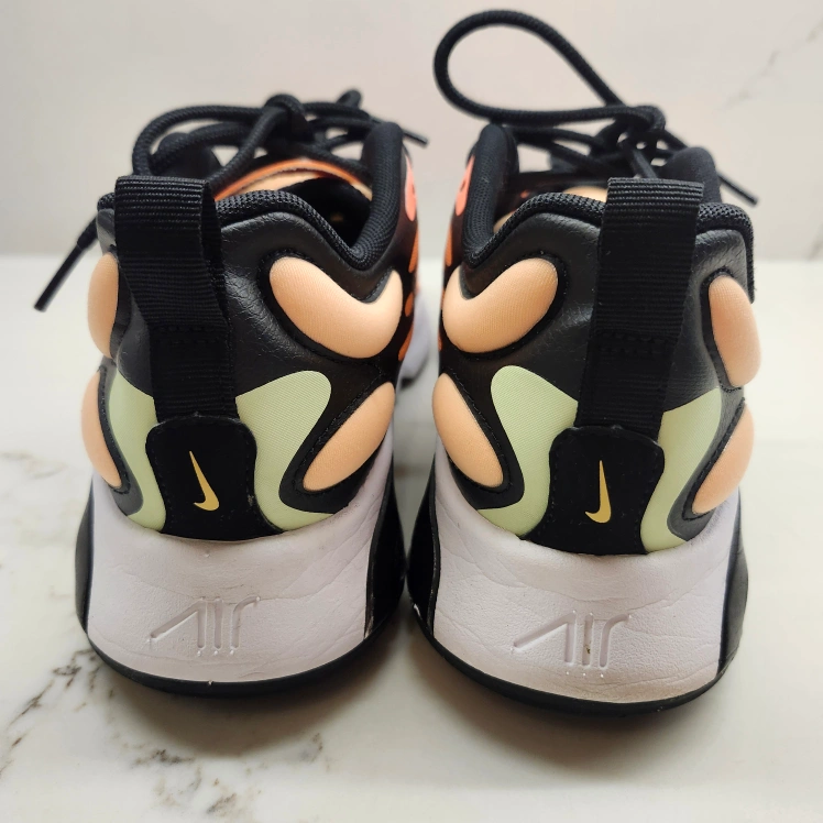 39Women’s Nike Air Max 200 Sunrise Orange Lifestyle Shoes. Size 8.5 US Excellent running shoes. Peach and black colourway. Lightweight and comfortable design. Great for everyday wear or sports.