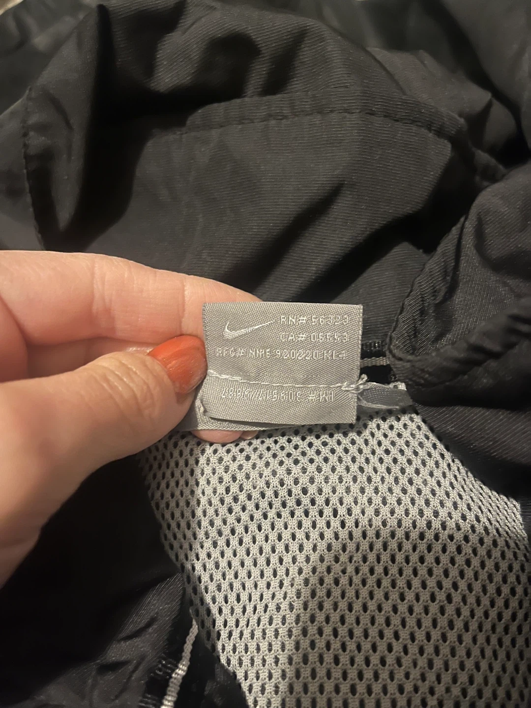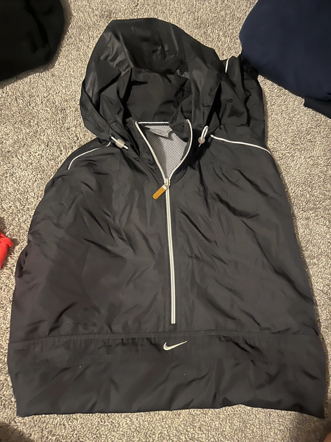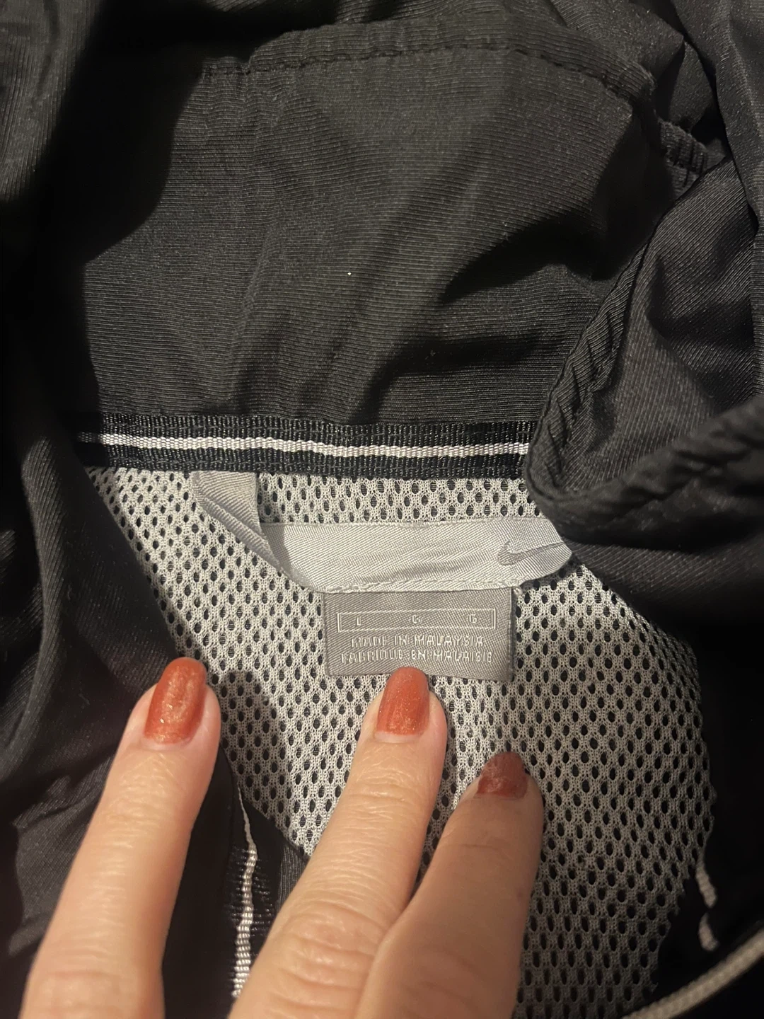 Selling a black Nike windbreakerjacket in size L. It features a hood and a front zipper. Vintage see serial #