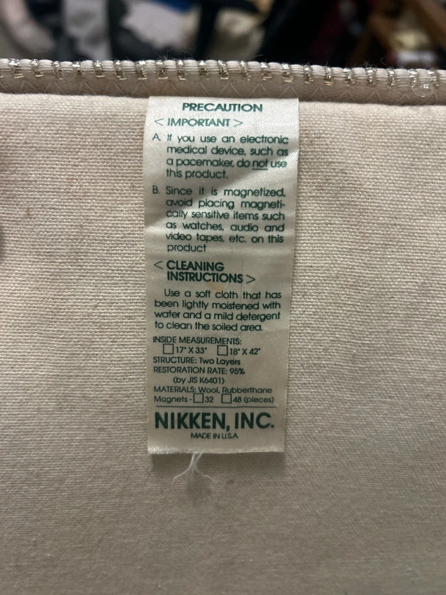 245This Nikken Kenko Seat is designed for comfort and support, featuring wool and magnetic technology to promote relaxation while seated. This item is used and has some staining on the underside. This seat is made with wool, and has 32-48 magnets inside. Specifications: * Inside Measurements: 17" x 33", 18" x 42" * Structure: Two Layers * Restoration Rate: 95% (by JIS K6401) * Materials: Wool, Rubberthane * Magnets: 32-48 (pieces) It's like having a little spa day for your rear!