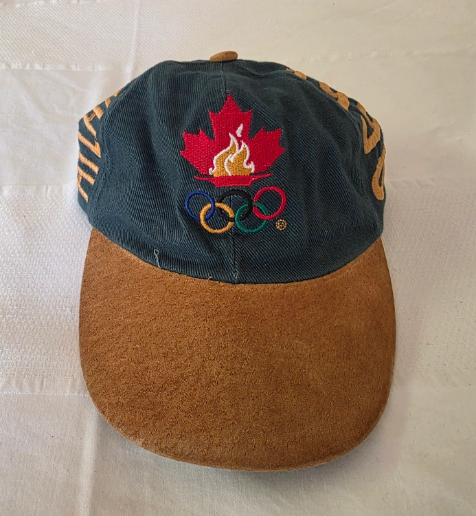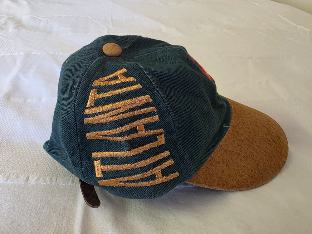 Vintage, green 1996 Atlanta Olympics adjustable hat. Brown, suede brim. Brown, Leather strap. Used condition.