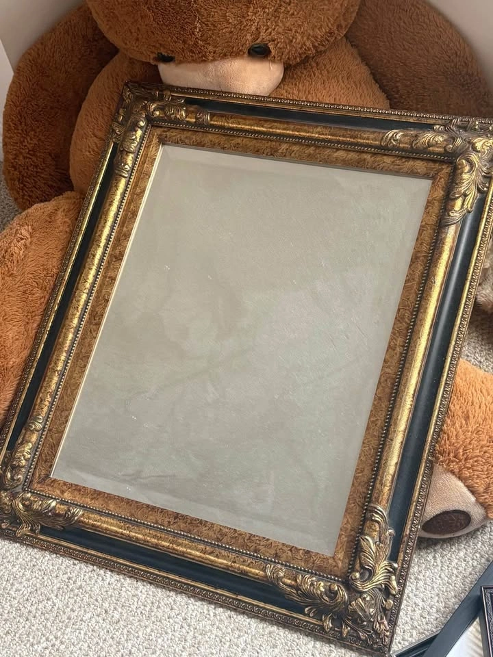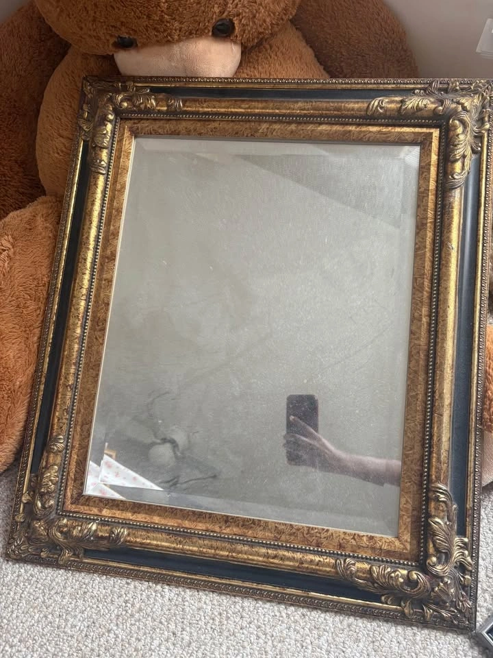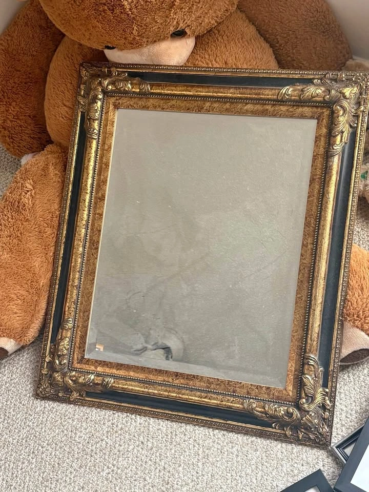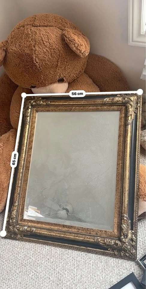 Elegant vintage-style mirror with an ornate gold and black carved frame. Perfect statement piece for an entryway, bedroom, or living room. Frame features beautiful detailing and a timeless antique look. Dimensions: 65 cm (height) x 56 cm (width) Condition: Gently used, solid and sturdy, glass is clear.