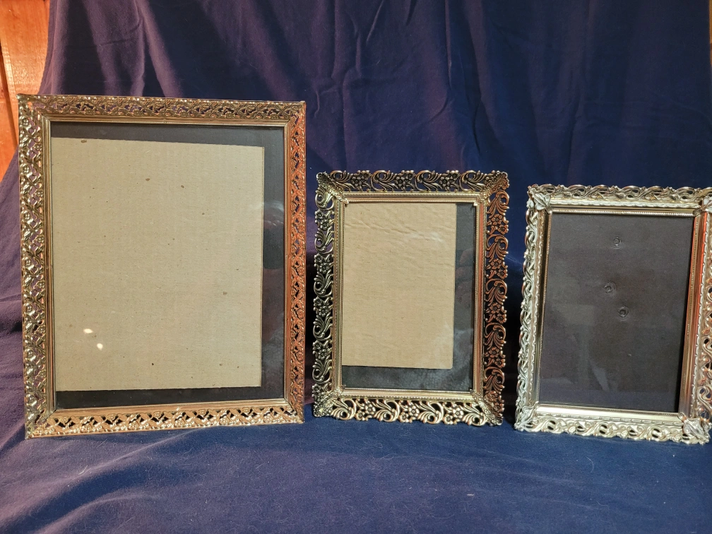 65Selling a set of three vintage picture frames with ornate detailing. They are in good condition and ready to display your favourite memories! The frames have a beautiful, classic look that would complement any decor 8x10 and 4x6