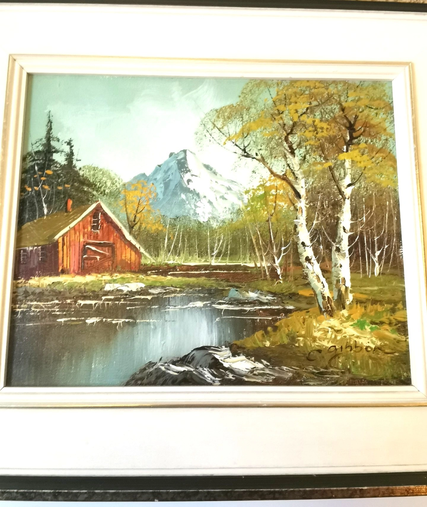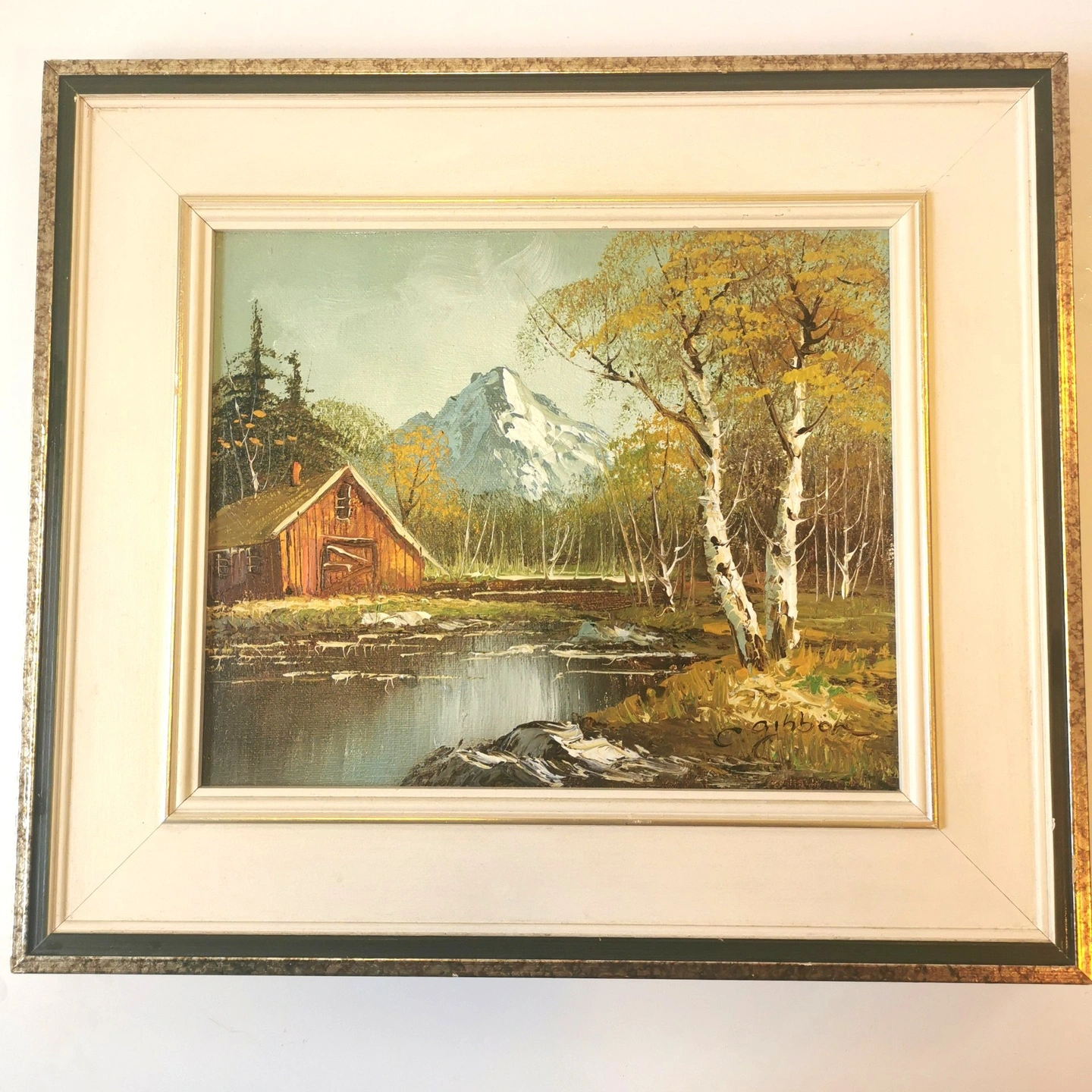 Capture the essence of the great outdoors with this vintage oil painting by C. Gibbon. The artwork showcases a serene nature scene that brings the beauty of the natural world into any space. With its rich textures and earthy tones, this oil painting was crafted using traditional techniques to produce a piece that's both timeless and evocative. Ideal for collectors and nature enthusiasts alike, this painting serves as a picturesque addition to any room. The artist's C. Gibbon signature adds to its authenticity and charm. Whether displayed in a living room, bedroom, or office, it's sure to create a peaceful ambiance and spark conversation. Good vintage condition blemish on frame please see photos as they are part of the description. Dimensions- 14.5 inches height, 12.75 inches width, 1.25 inches depth