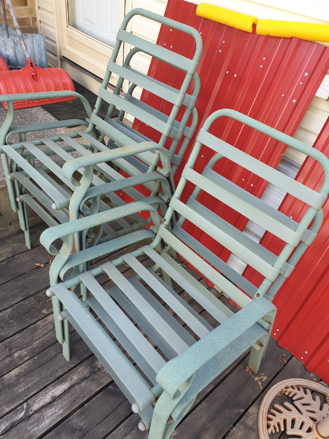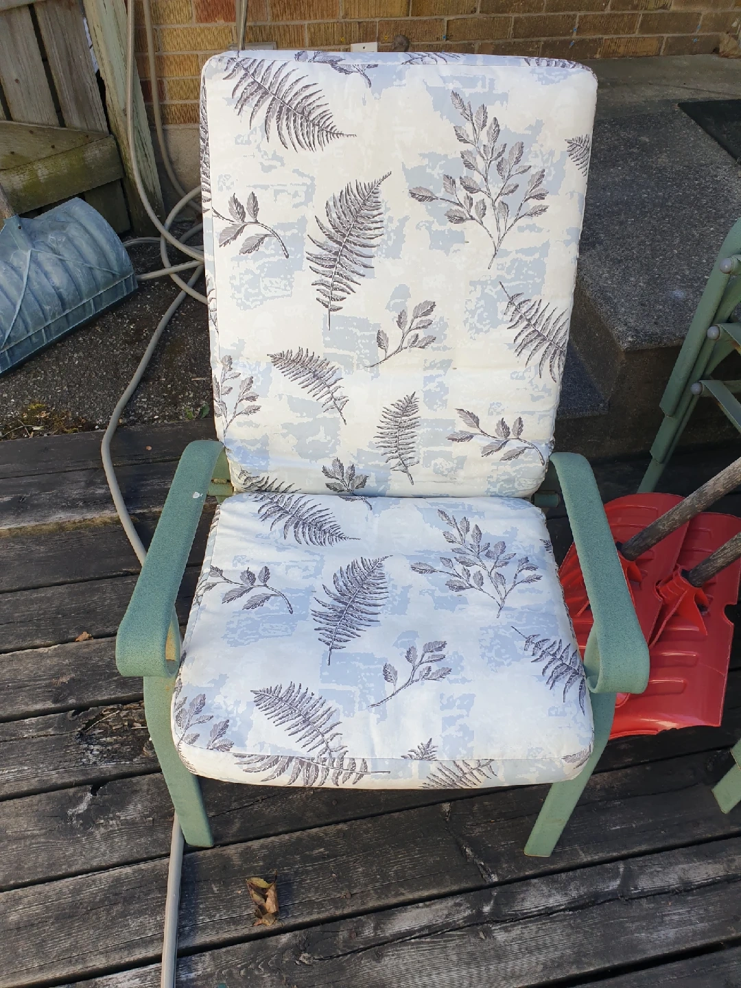 I'm offering a set of vintage metal patio chairs and table, perfect for adding a touch of retro charm to your outdoor space. These chairs and table, while showing signs of their age, are sturdy and comfortable, ready for relaxing afternoons in the garden. The set includes six chairs with a unique fern design on the cushions, Here are some details: * Classic metal frame construction * Comfortable seating These chairs are ready to be the newest outdoor decor to make your neighbors jealous. If the ad is up, the chairs are available! Looking at similar listings on Kijiji, I think $50 is a fair price for the set. OBO Table L54 X W36 X H281/2 no holds first pu