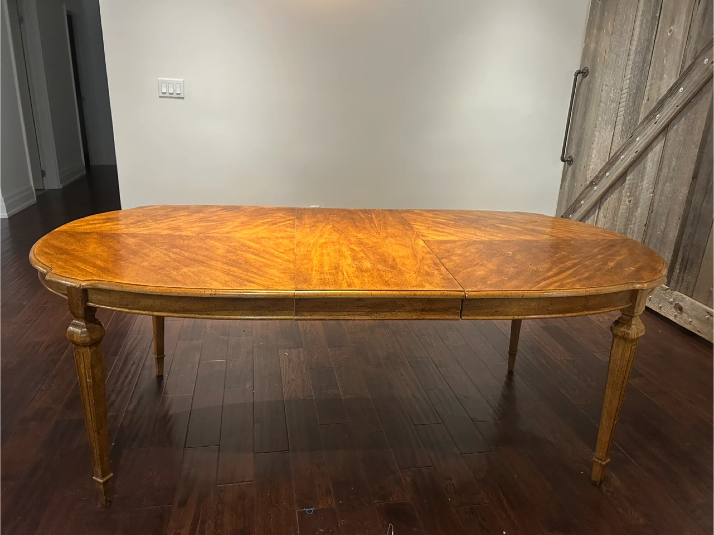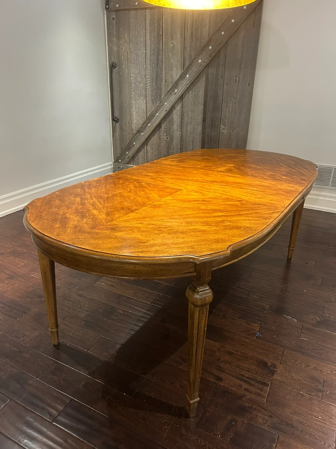 10Selling a lovely vintage oval dining table! It's in good condition and would be a great addition to any dining room or kitchen. The table features a beautiful wood grain pattern. It can convert to seat 6, 8 or 10 with 2 wooden inserts that are easy to take in or out.