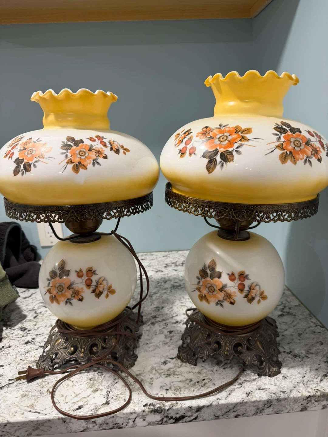 10$150 for the pair Add some vintage charm to your space with this beautiful matching set of electric hurricane lamps. Each lamp features hand-painted orange and gold flowers on frosted white glass with a soft yellow fade. The ornate metal bases and ruffled tops give them a classic antique look.