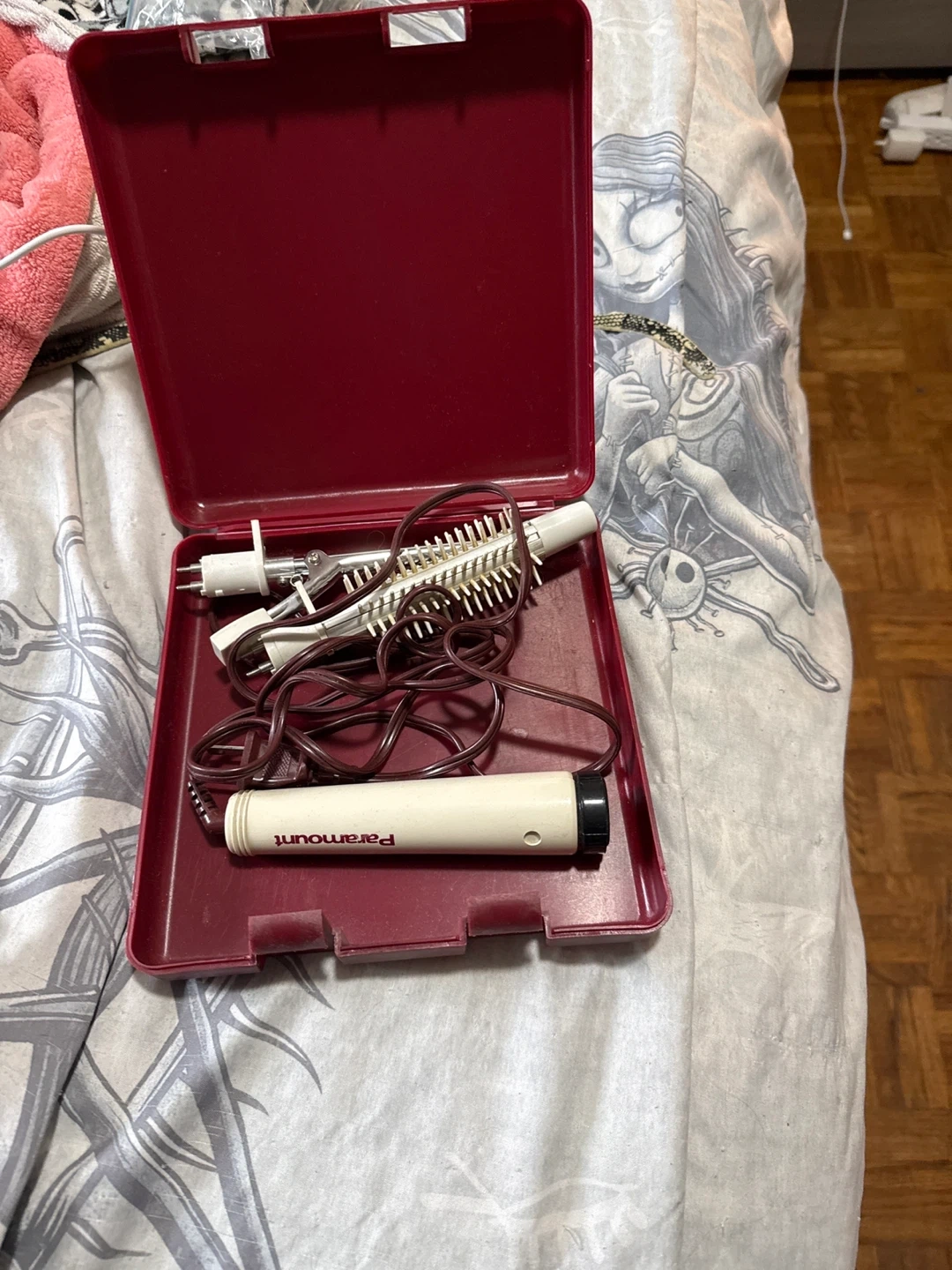 Selling a vintage Paramount styling brush set. It comes in a maroon carrying case. The set includes several brush attachments and a handle. Perfect for creating a variety of hairstyles!