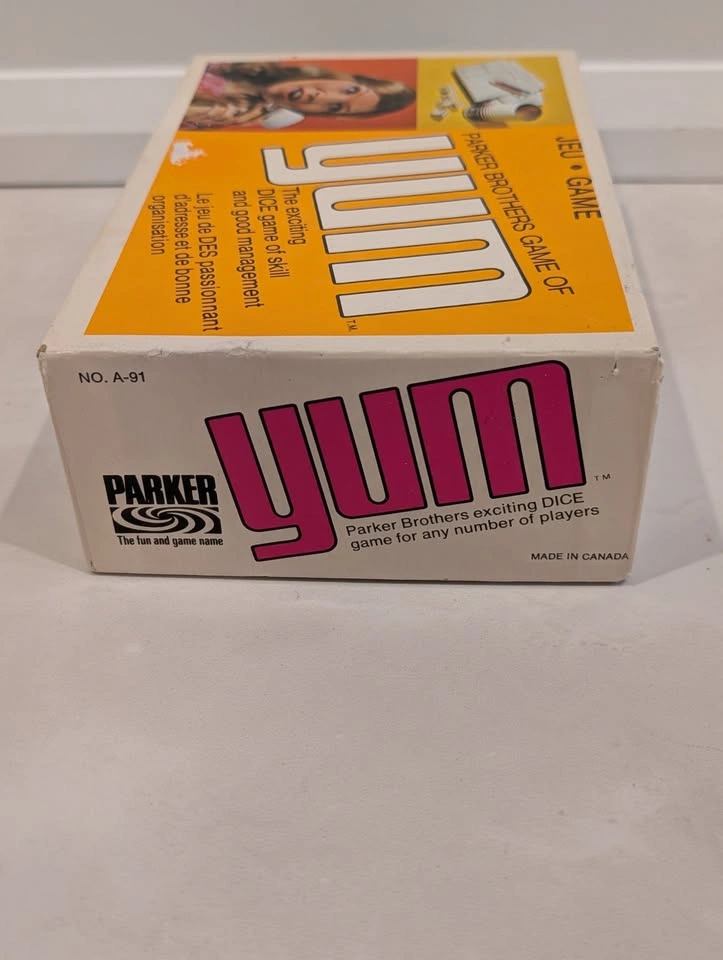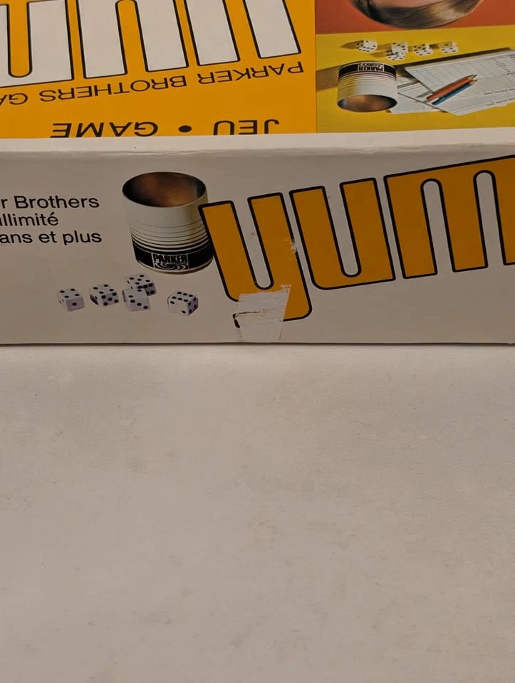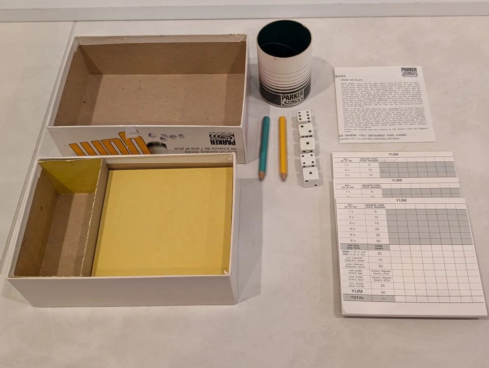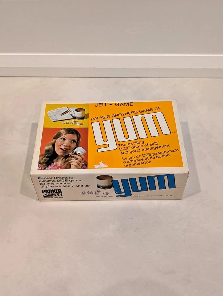 52Looking for a fun, retro game night addition? Selling this classic vintage "Yum" dice game by Parker Brothers! It's a bilingual Canadian edition, similar to Yahtzee, and perfect for family fun. Condition: The box has damage to the design and wear from use. Contents: Includes the dice, shaker cup, score pads, pencils and original instructions. Ages: For any number of players, ages 7 and up. Era: Believed to be from the 1970s. Grab this exciting game of skill and good management for your collection or next game night!