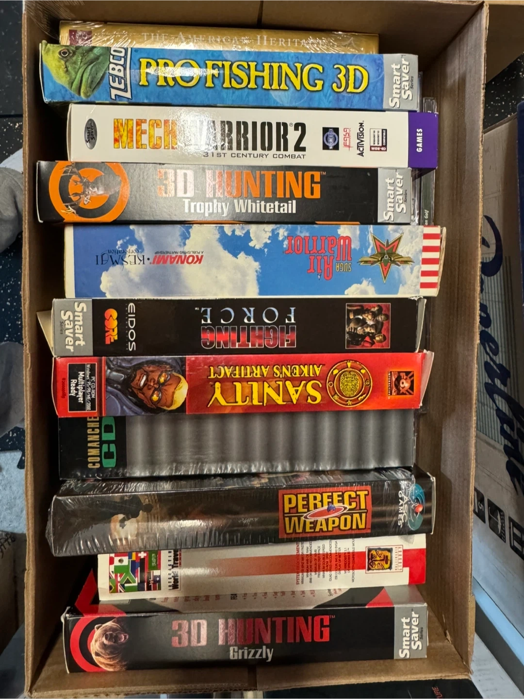 54Selling a collection of vintage PC games. Titles include Pro Fishing 3D, Mech Warrior 2, 3D Trophy Whitetail, Air Warrior, Fighting Force, Aiken's Artifact, Sanity, Comanche CD, Perfect Weapon, 3D Hunting Grizzly, The Elder Scrolls: Daggerfall, NHL 99, Interstate 76, SW: The Galaxy Will Burn, Gear Styx, Andretti Racing, MBA II, Sat Act, Creature Shock, and Magic World Teen. Great for collectors! 30 dollar