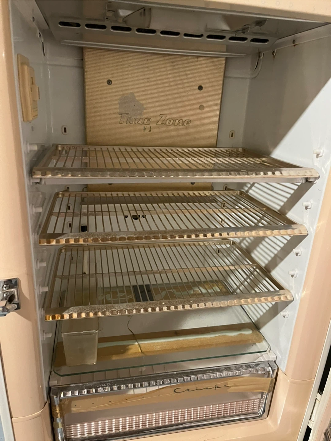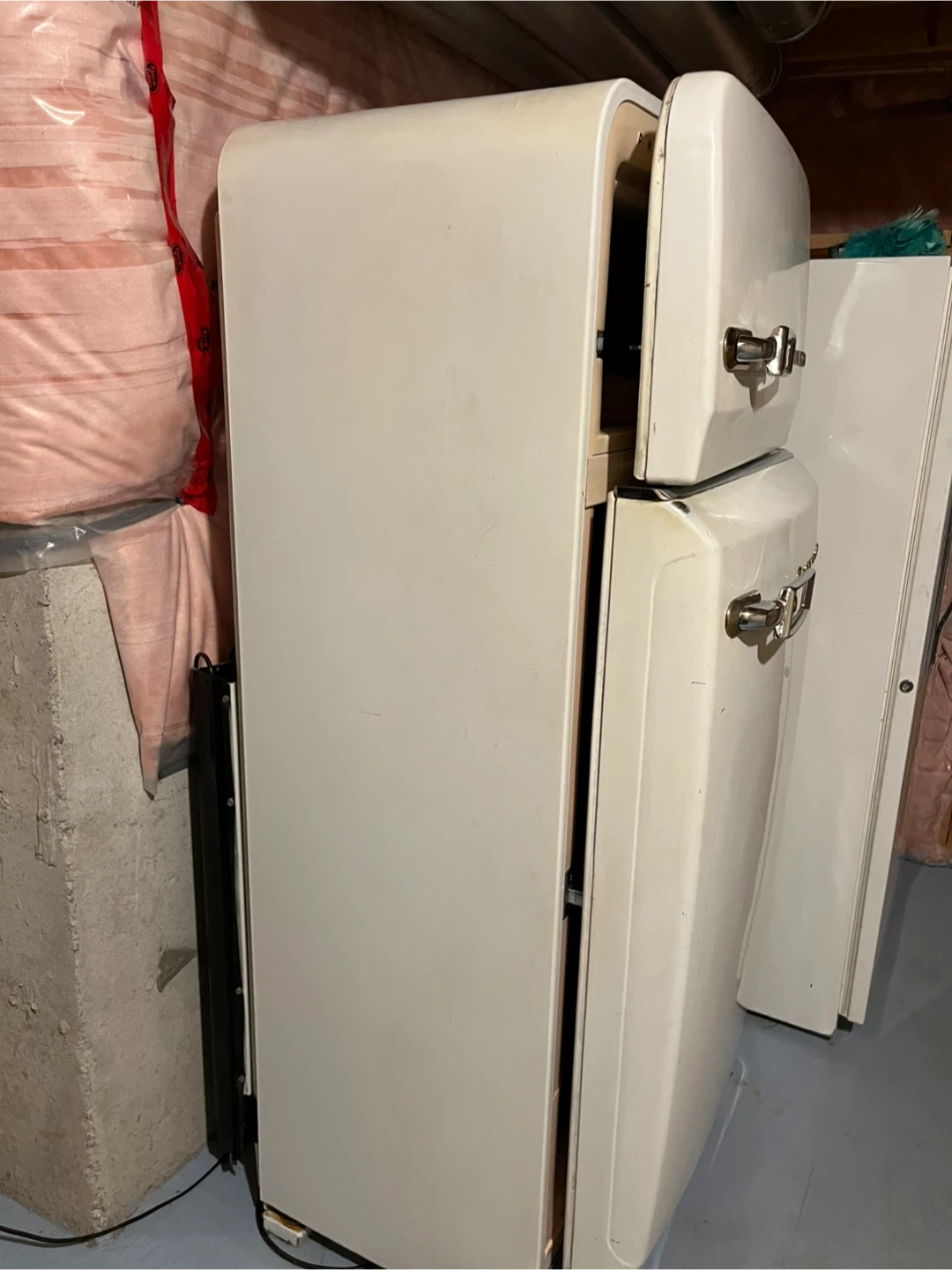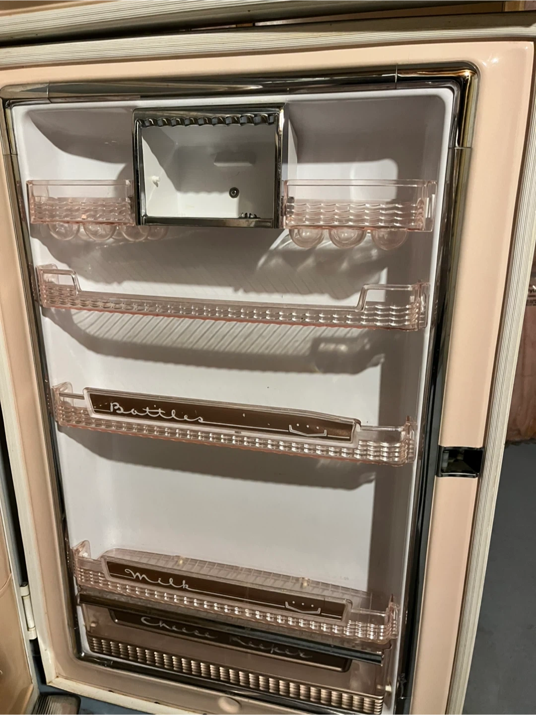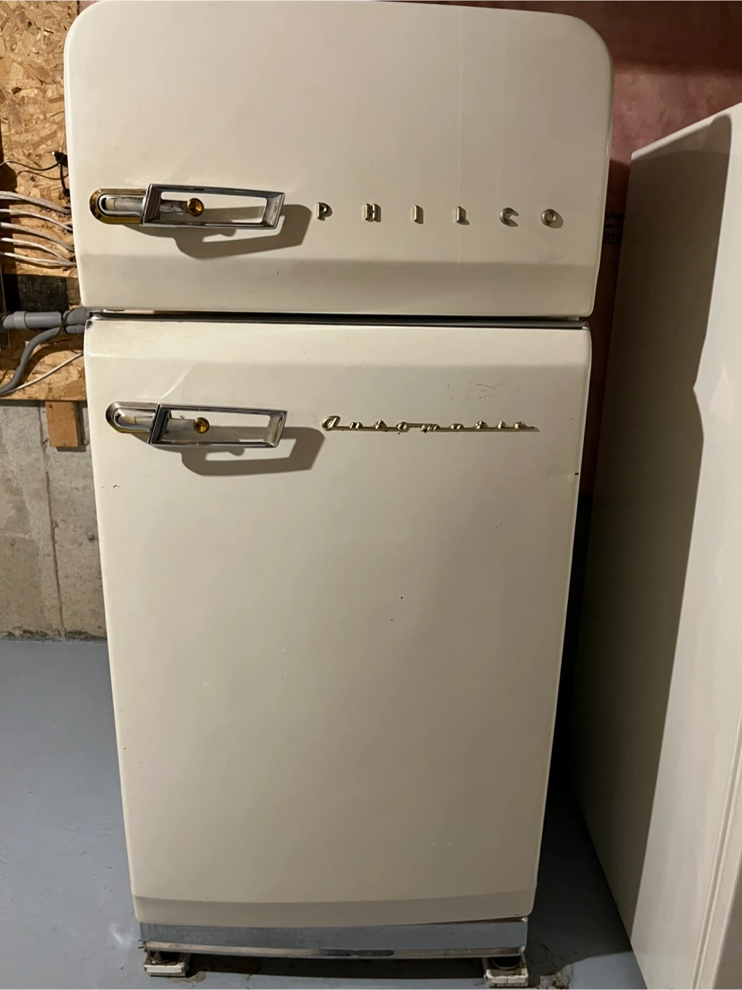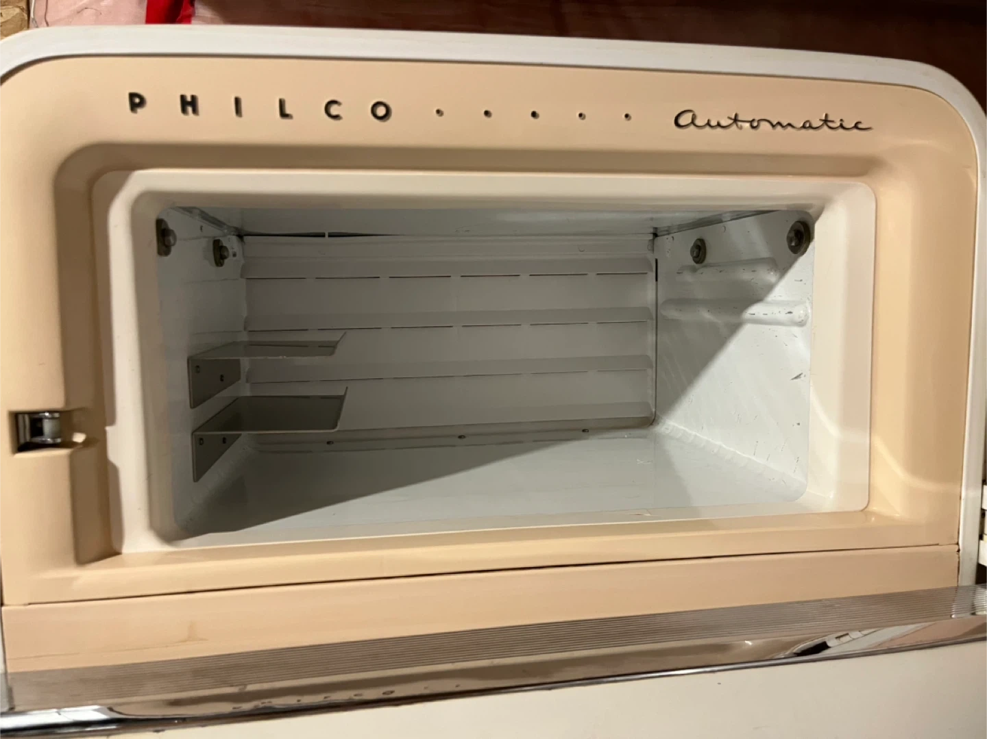10Selling a vintage Philco Automatic refrigerator. It has a unique retro look with its cream and white colour scheme. The interior features shelves labelled for 'Bottles', 'Milk', and 'Cheese & Crispers', adding to its charm. Perfect for a collector or someone looking to add a touch of nostalgia to their kitchen!