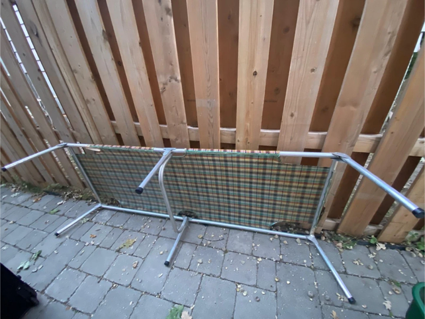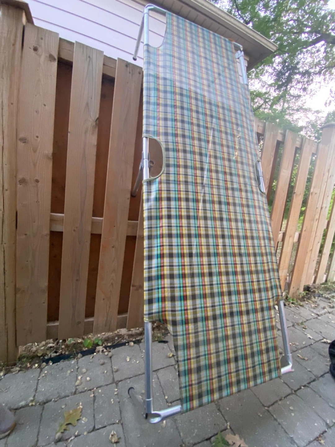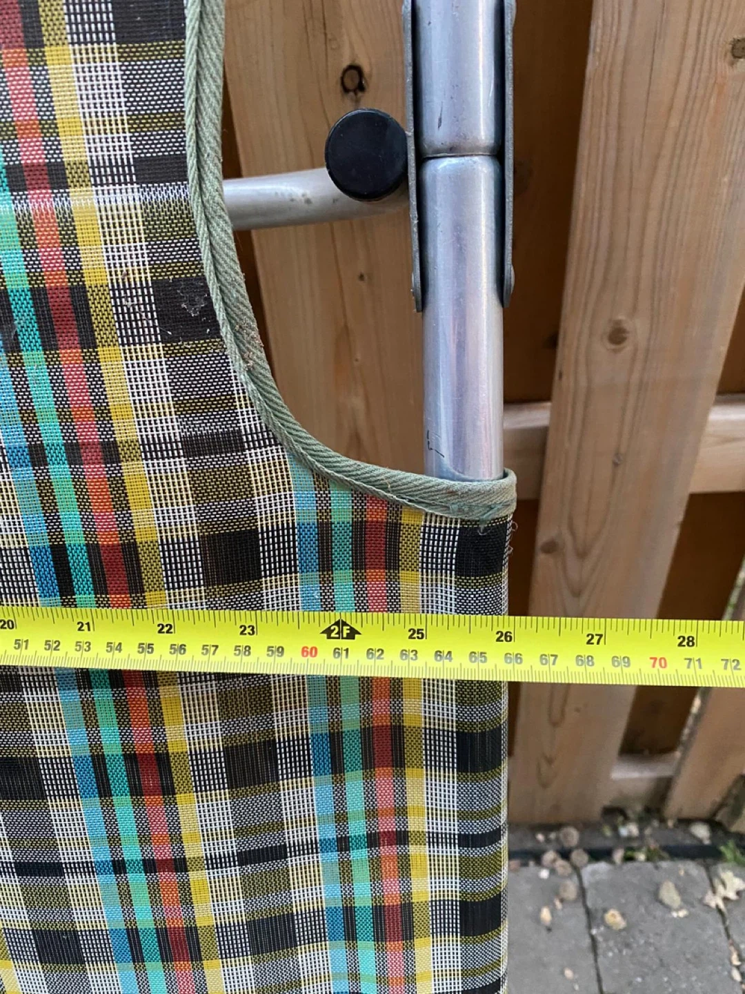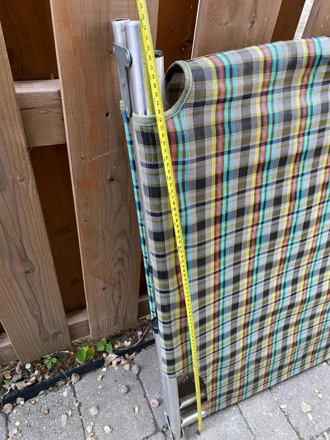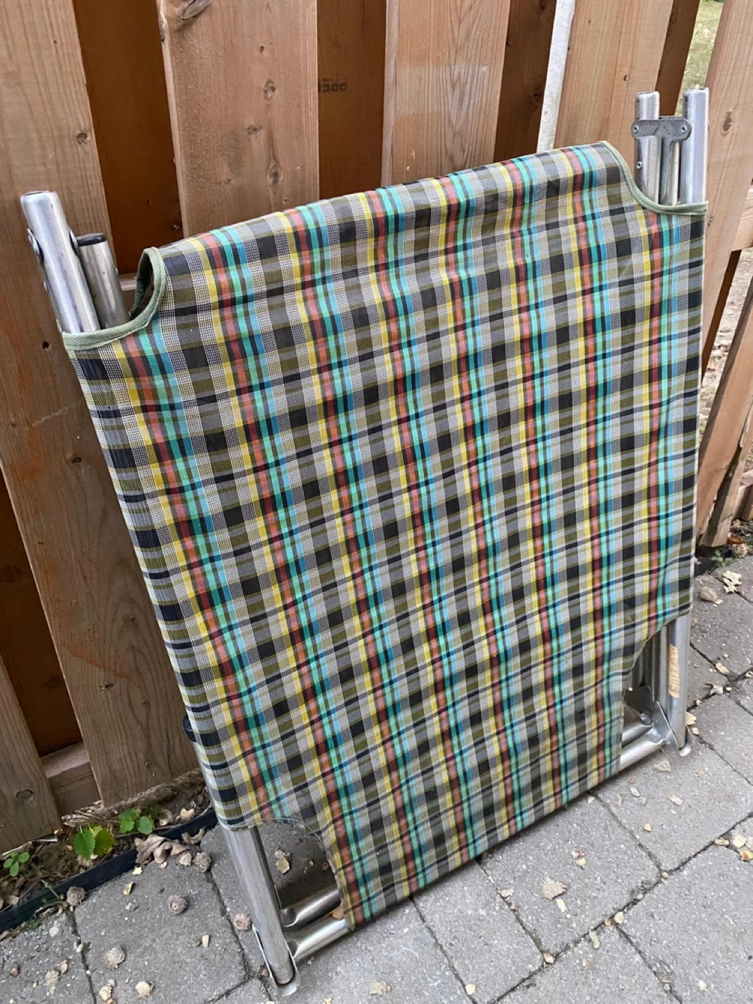 Selling a vintage folding cot with a colourful plaid pattern! It's in great shape and ready for camping or relaxing in the backyard. The cot measures approximately 72 inches long and 27 inches wide. It's lightweight and easy to fold for storage or transport