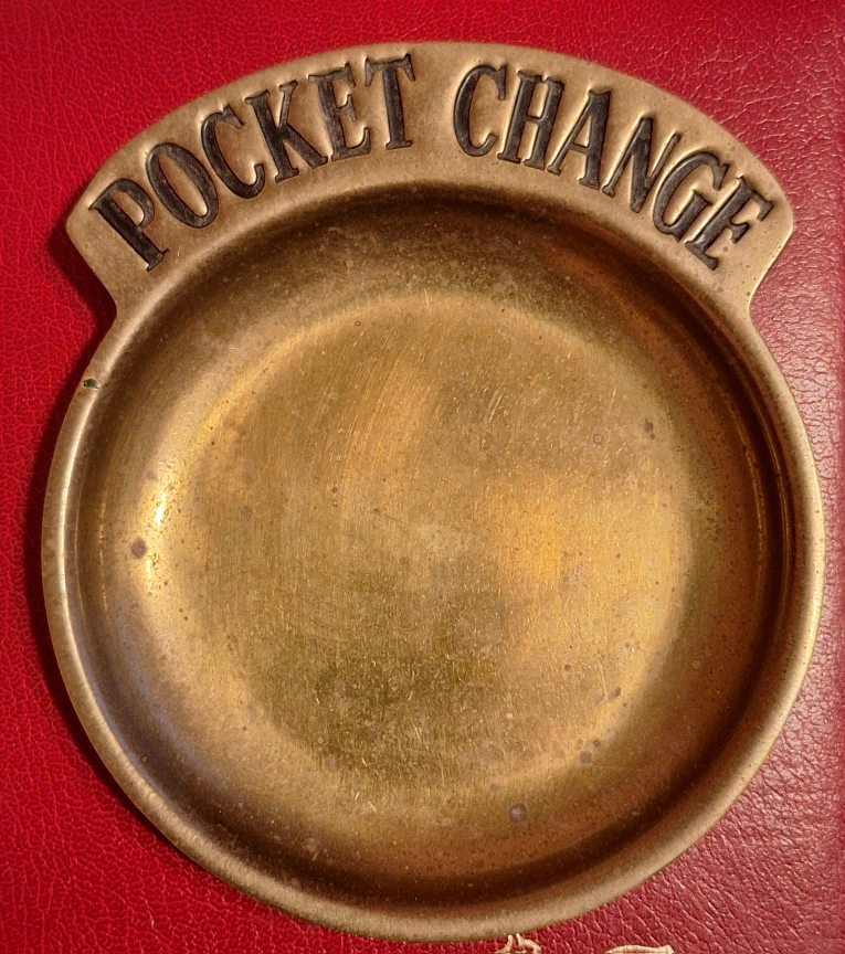 Selling vintage brass tray with 'Pocket Change' inscribed on it. 5 x 5.5 inches