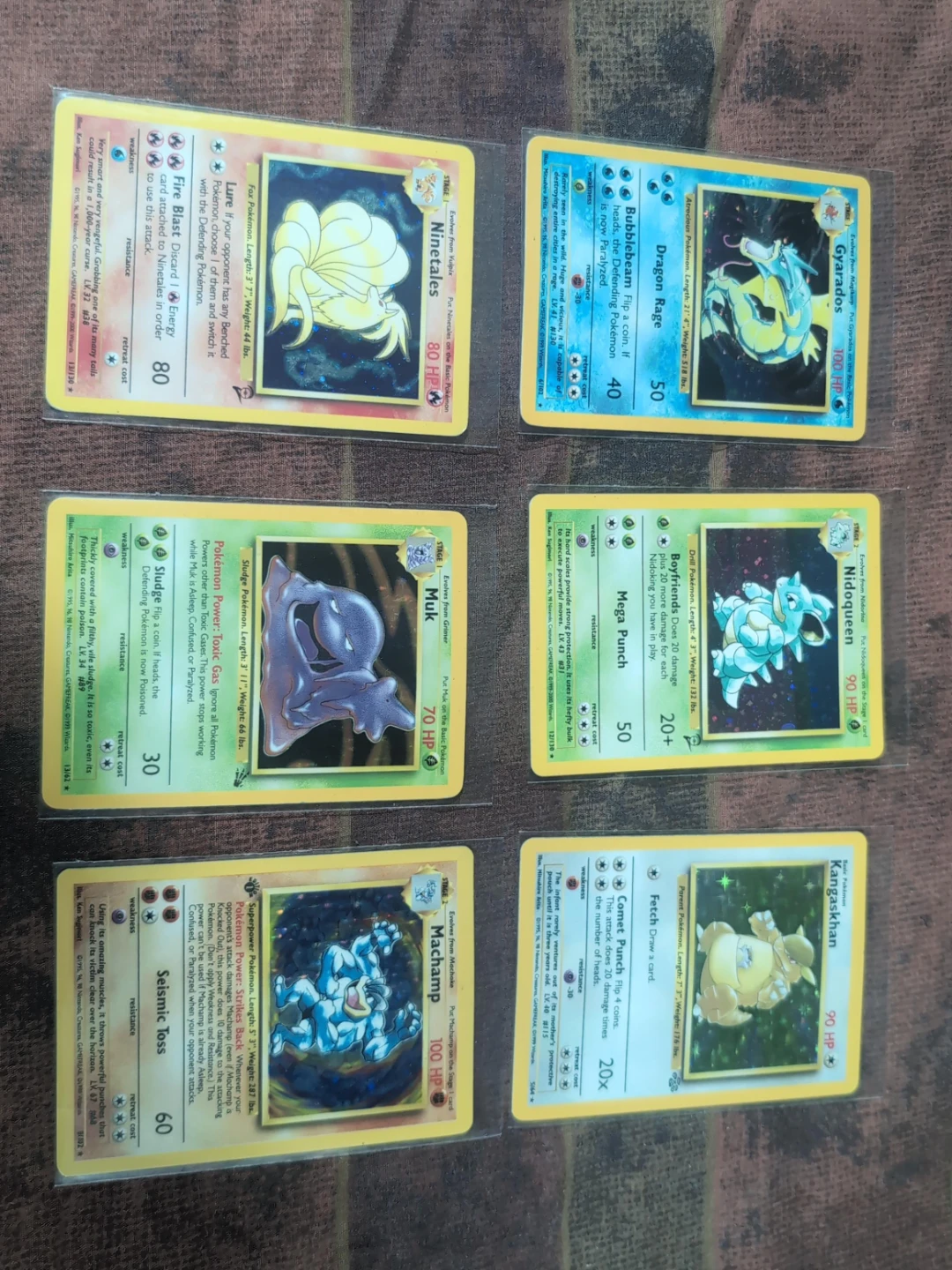 60Selling a set of vintage Pokémon cards! Includes Ninetales, Gyarados, Muk, Nidoqueen, Machamp, and Kangaskhan. All cards are in protective sleeves. Cards are in okay to played condition asking $40 for the lot.