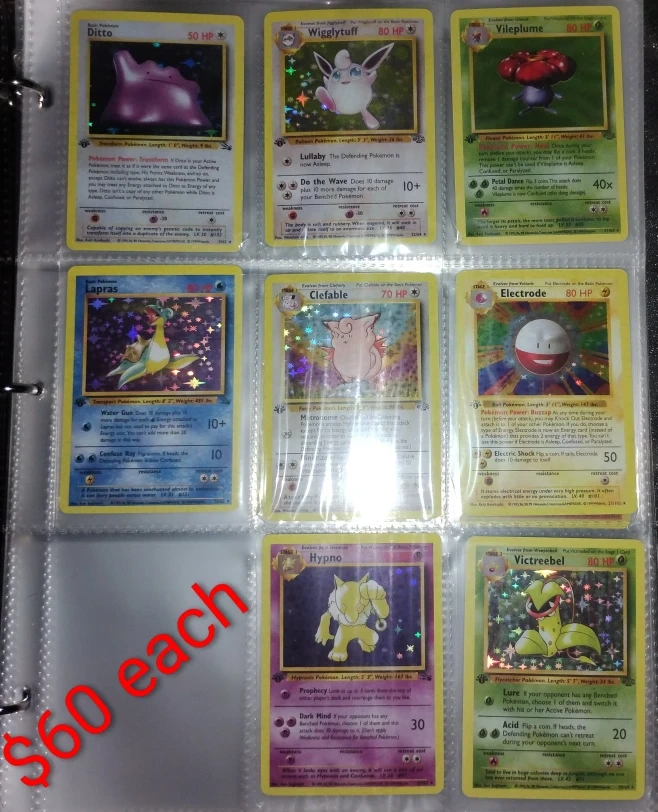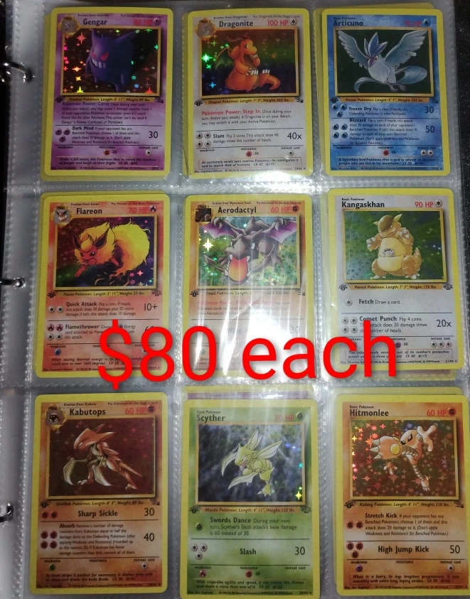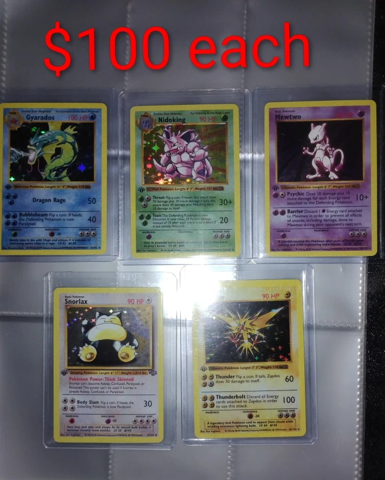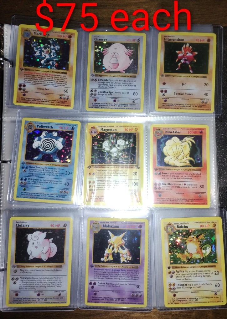 Selling a collection of vintage Pokemon cards. base set, 1st edition holographis. Basic prices labelled on pictures. Some negotiation possible. Can make deals if you take more than one. Also open to exchange for silver/gold.