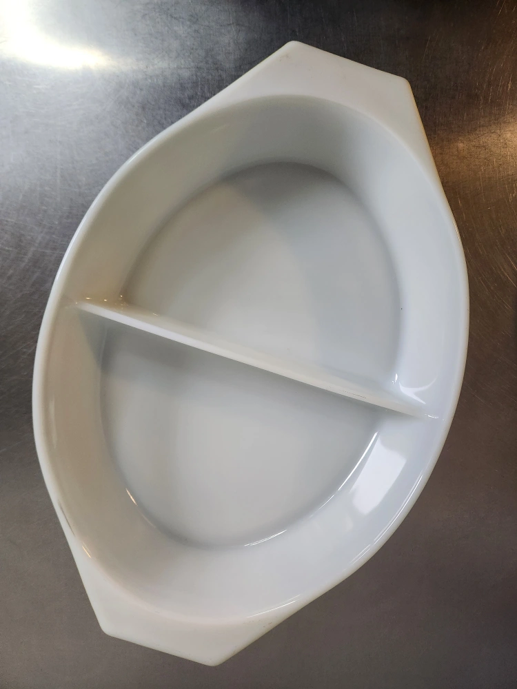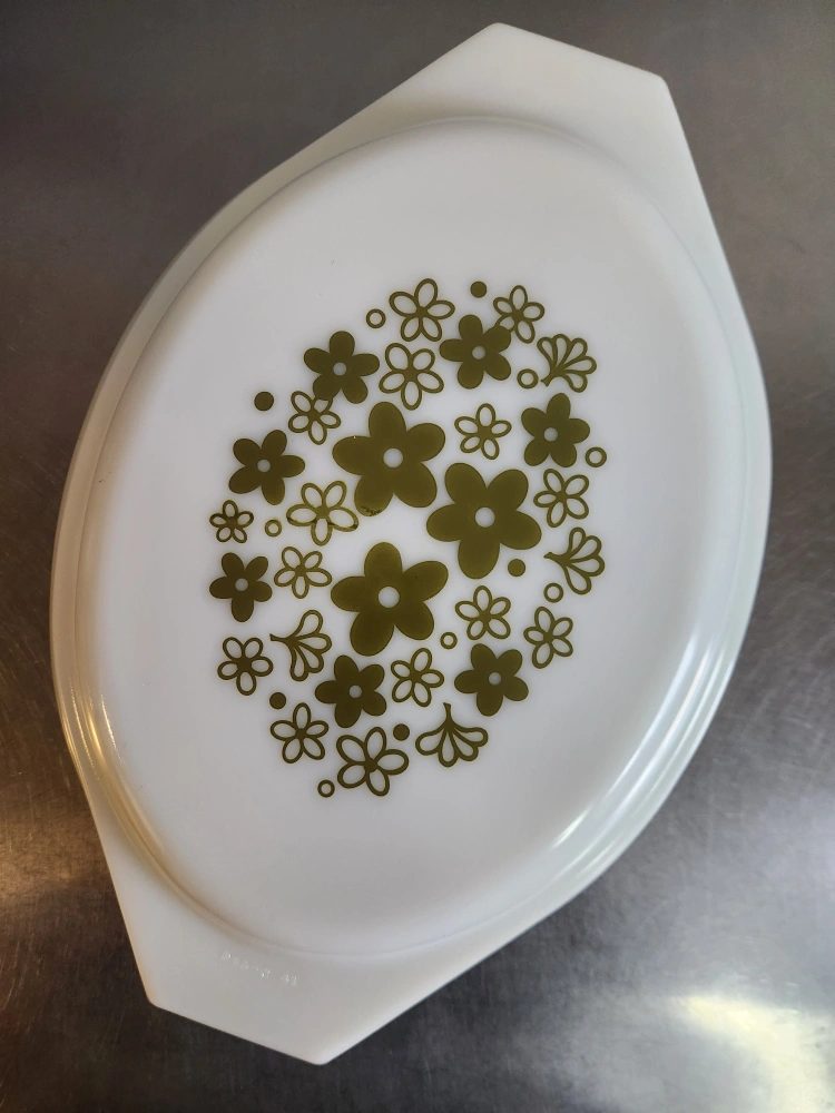 132Vintage Pyrex divided casserole dish. Avocado green exterior, white interior. Features a floral pattern on the lid. Oval shape. Great for serving or storing.