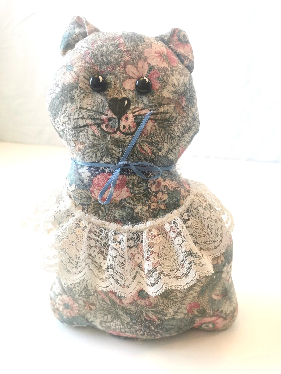 60Crafted with care, this vintage Weighted Door Stop is a charming addition to any home, featuring a quaint kitty cat design. Its quilted fabric construction not only adds a touch of folk art flair but also ensures durability and longevity. Perfect for those who appreciate handcrafted items, this door stop is a testament to skilled artisanship. The large mid-century style cat door stop is an ideal choice for collectors and cat enthusiasts alike. The quality and attention to detail are evident in every stitch. This hand-made piece is sure to be a conversation starter and a treasured part of any decor collection. Good vintage condition light wear on fabric please reference photos as they are part of the description of the item. Dimensions- Height 11.5 inches, Width 7.5 inches, Depth 3 inches