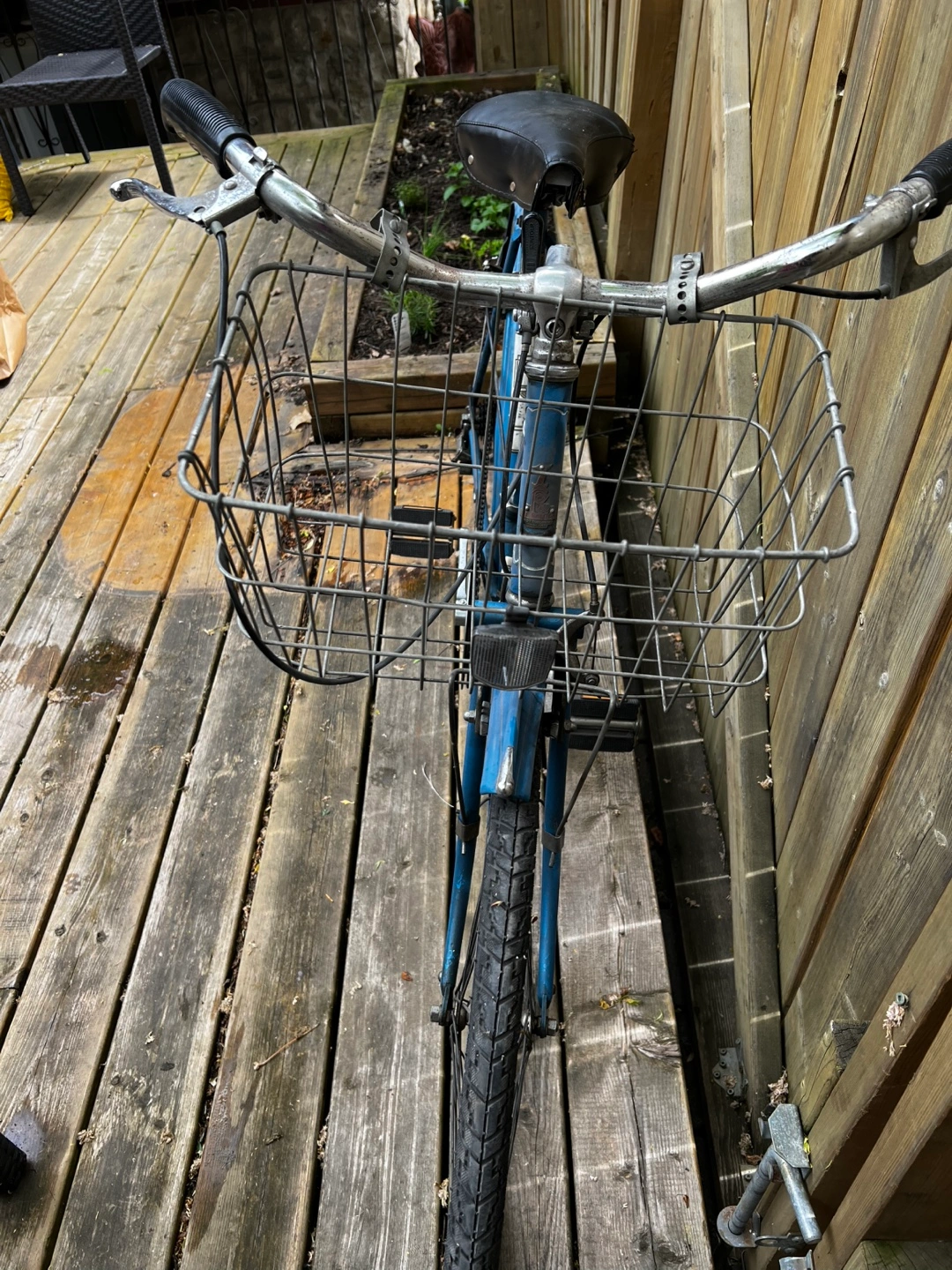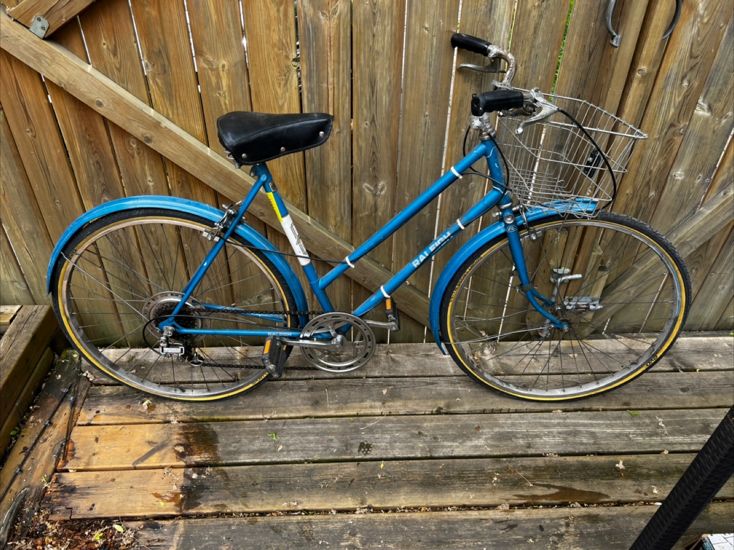 81Blue Raleigh bicycle. Features a wire basket and original components. Leaver gear system. Great for restoration or casual riding. Working condition but will need a tune up and tire inflation. Price negotiable
