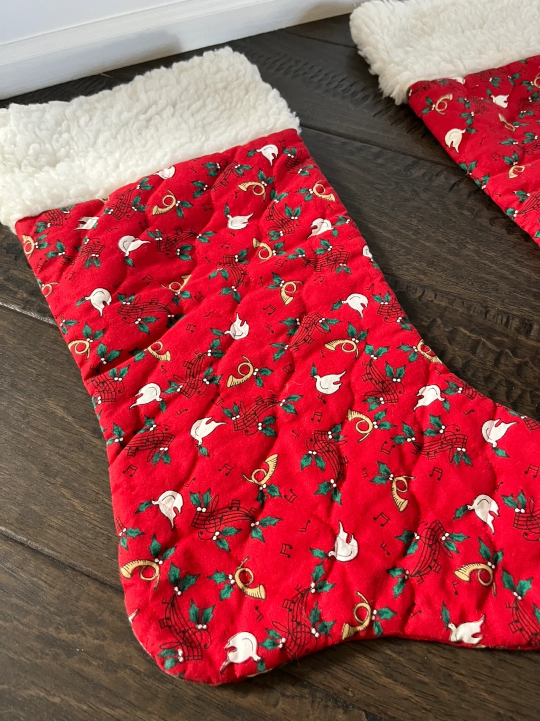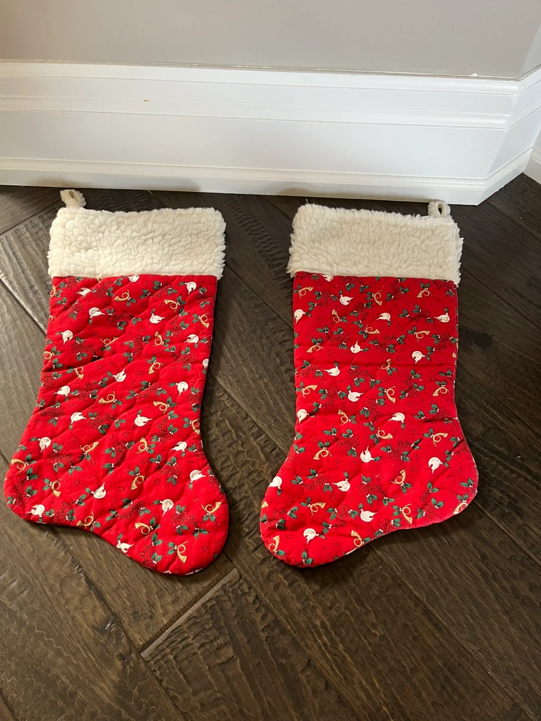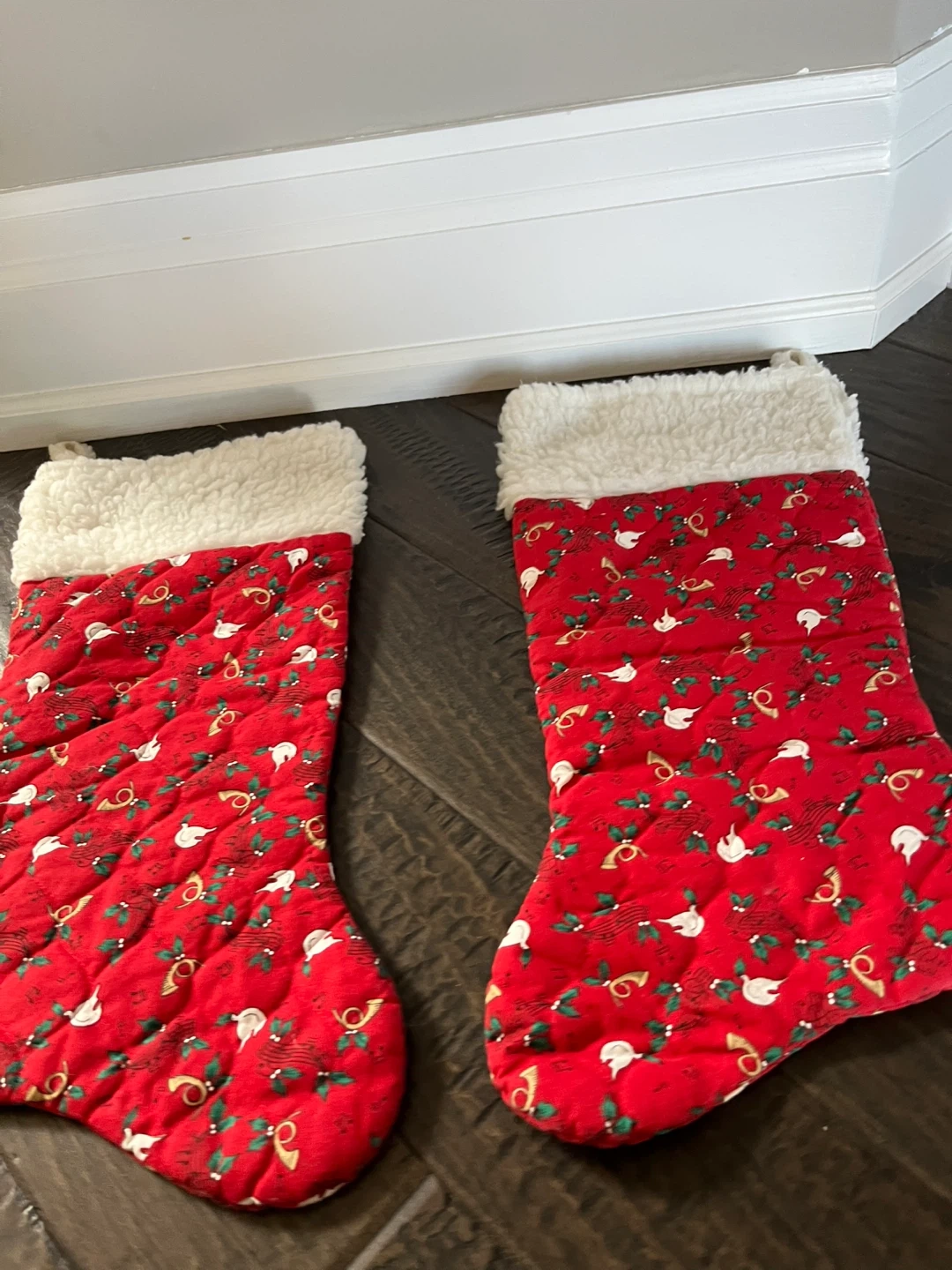 Selling these two red vintage Christmas stockings $10 each Pickup Hamilton Mountain Rymal & Upper Gage Message me for delivery inquiries Cash only Checkout my other listings for more great deals!!