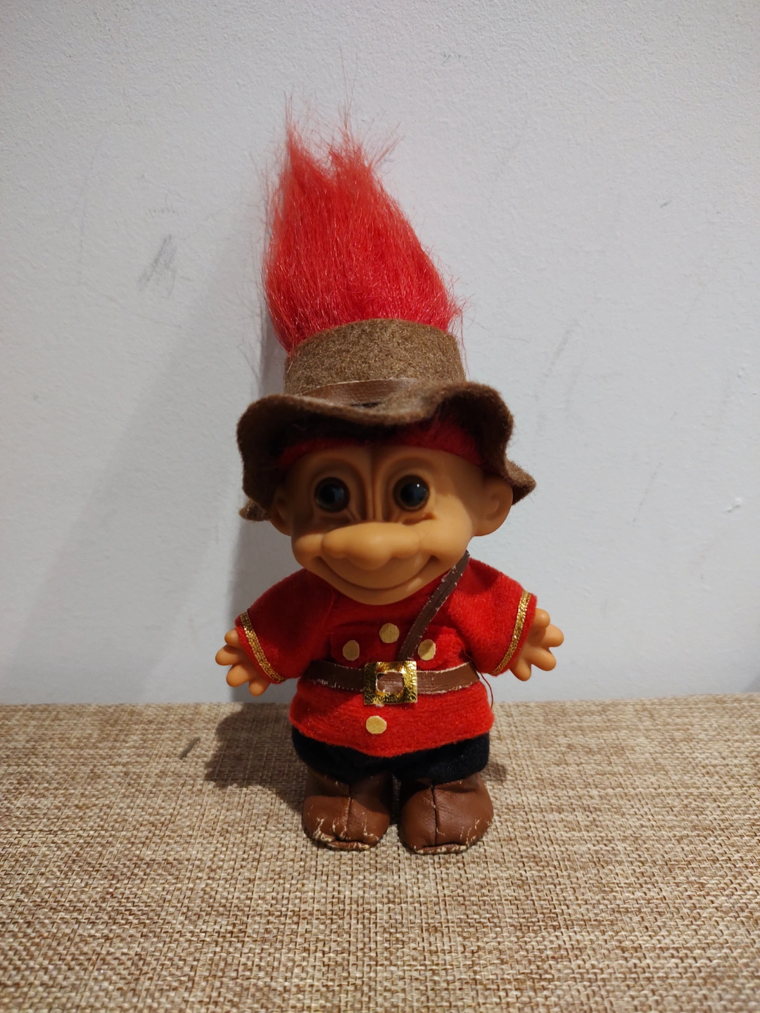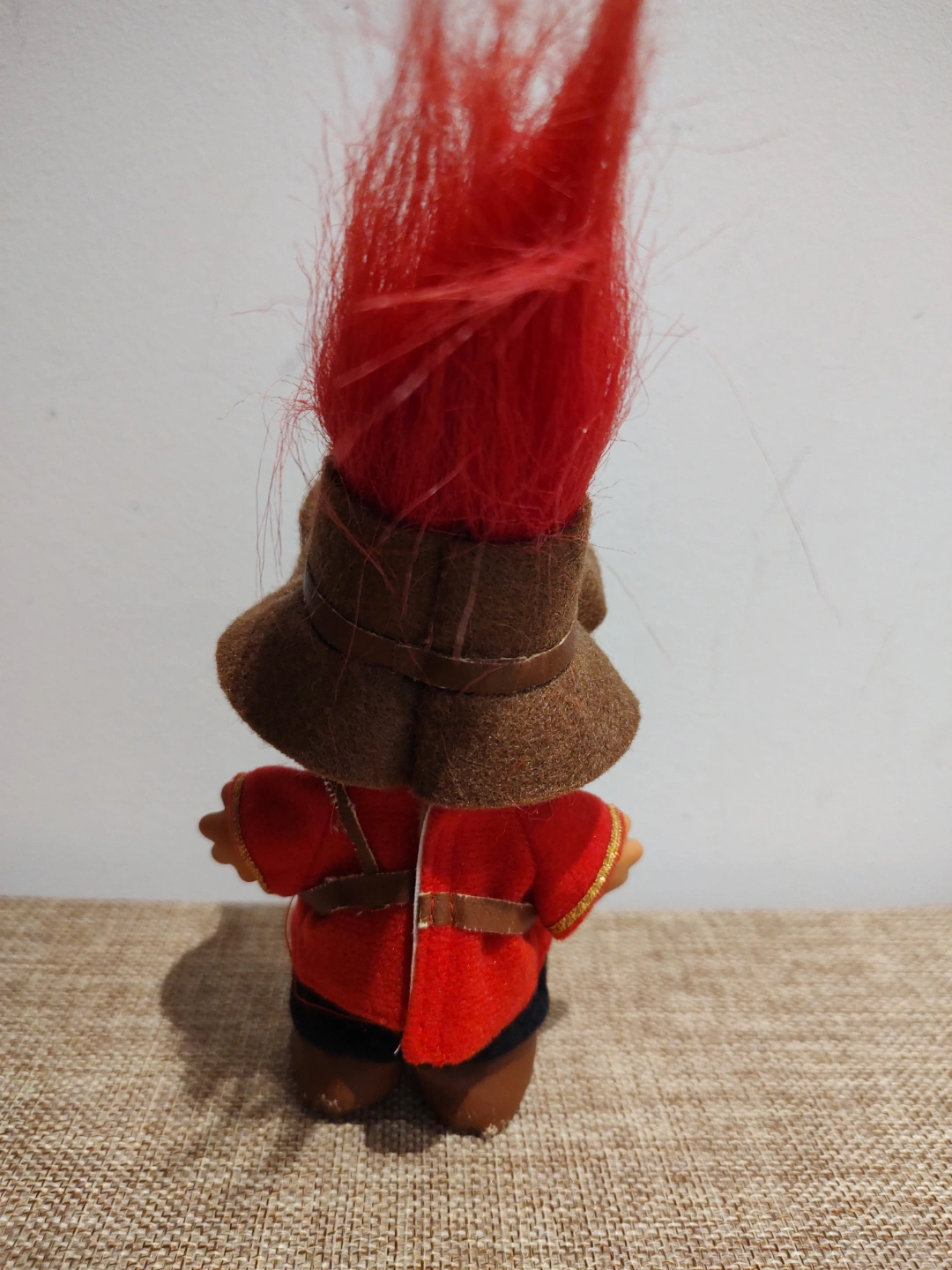 Collectible troll doll. Bright red hair. Wearing a Mountie uniform. Brown felt hat. Good condition. Some wear on front of boots. Small size. 7" tall
