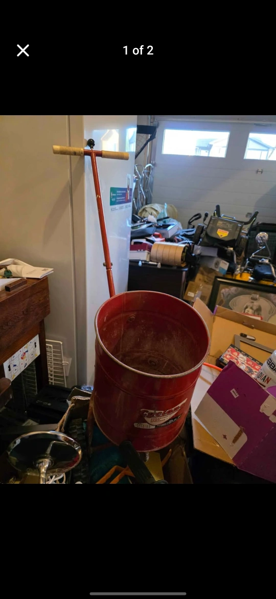 Selling a vintage red metal grass seeder has a long handle with grips and a bucket-like container
