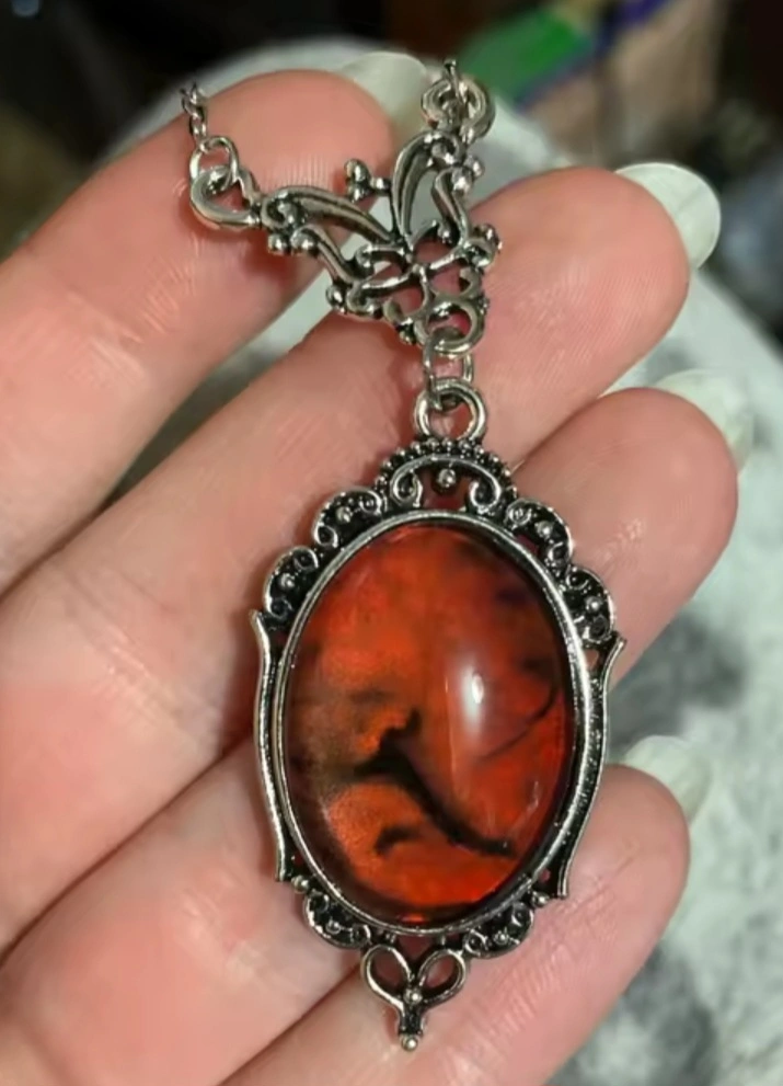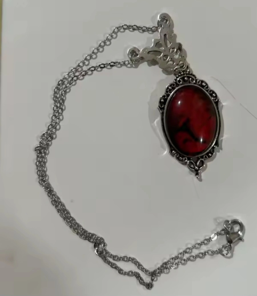Here's a lovely pendant necklace featuring a red stone. It has a vintage-inspired design and a silver-tone chain. The pendant has an oval shape with a decorative border. A unique piece to add to your jewellery collection