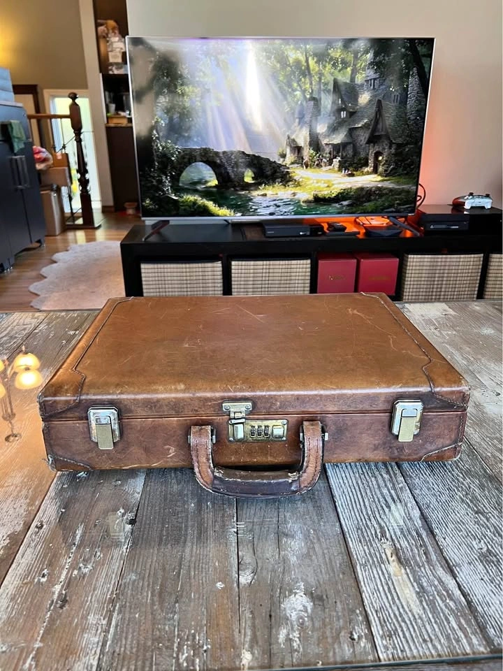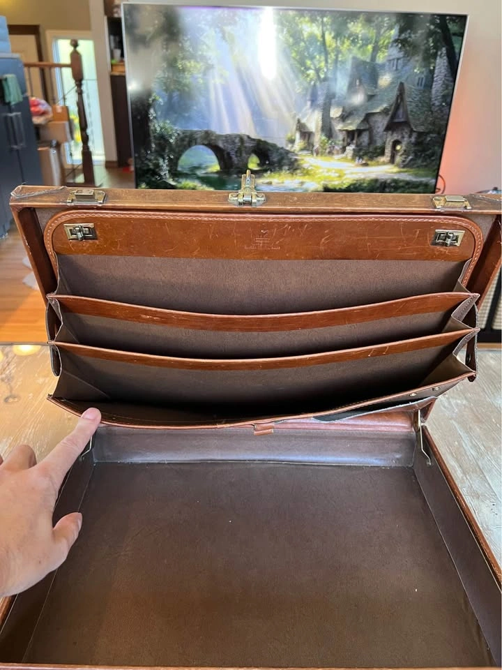 Authentic vintage Renwick leather briefcase, made in Canada from genuine glazed caribou hide. This hard-sided case features durable construction, reinforced corners, sturdy metal latches, and a classic top handle. The leather shows scuffs, scratches, and edge wear consistent with age and use. Handle has visible wear but remains functional. Interior is clean for its age. A rare Canadian-made collectible that’s both stylish and functional — perfect for vintage fashion, film/prop use, or everyday carry with character. Combination lock three digit 747 is the code that leads me to believe it may have been owned by a pilot or an aeronautical individual. Handle has some damage inner leather reinforcement is torn through only outer leather remaining on right side of handle, there are scratches and scuffs in the leather as it is very old but for the right setting would make a fantastic prop or vintage decor. The inside is very good all the sleeves are good shape and working, snaps and leavers working good. I don’t think this is something you would actually want to use on a regular bases mind you reinforcement on the handle and it could be done everything still works but I see this more as a very good prop or museum piece or something for a movie set. The patina and ware gives it a good look as an item in use for a vintage seen, with the leather quality and brand for a good well to do on the move setting.