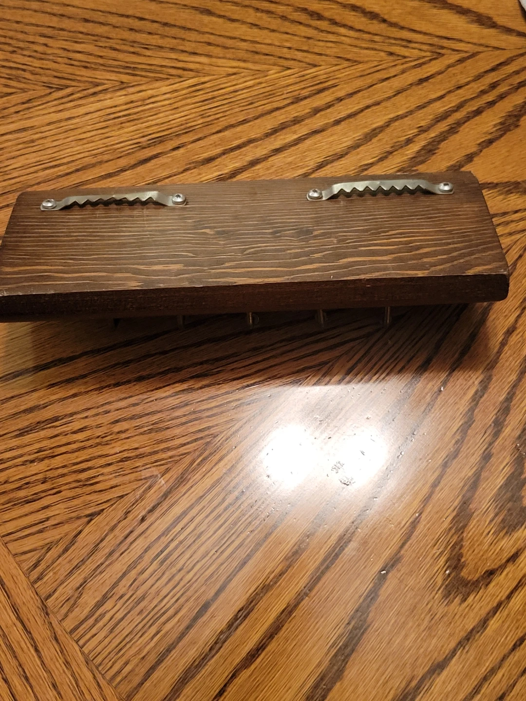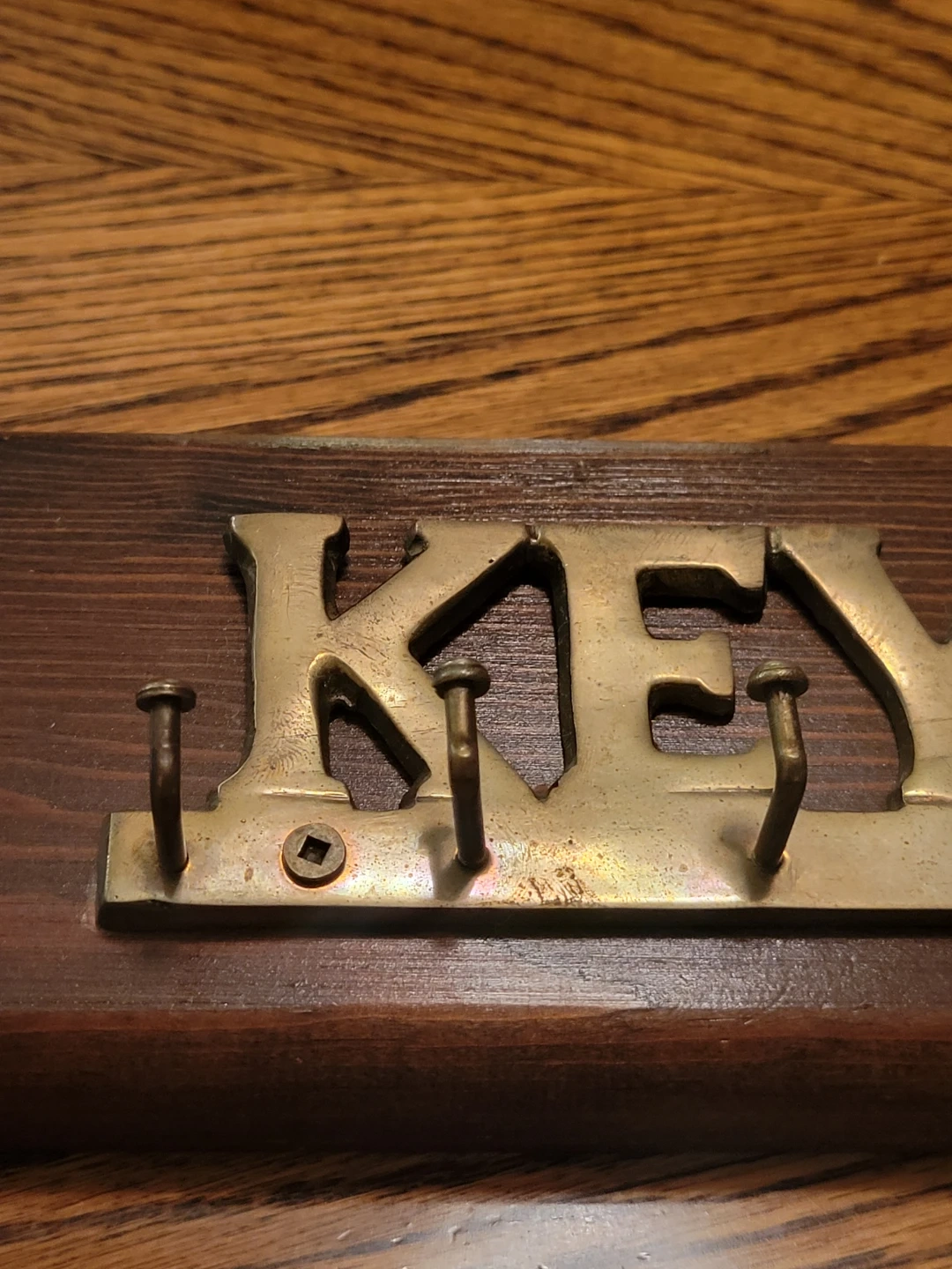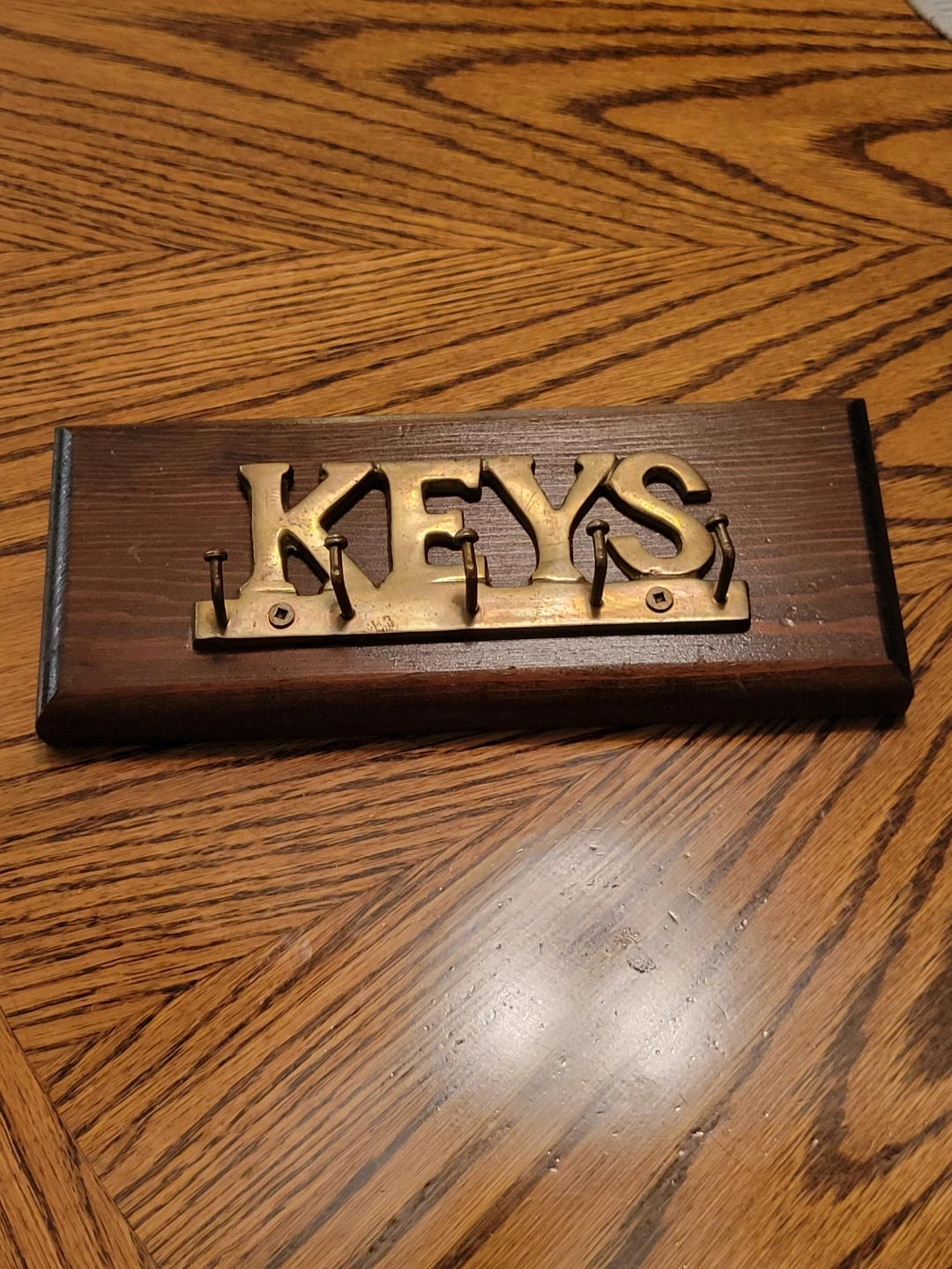103Vintage wood and brass key holder, perfect for adding a touch of retro charm to your entryway! The solid wood backing and brass "KEYS" lettering with hooks are in good condition. It's a unique piece to keep your keys organized with a bit of vintage flair. 2 hooks on back Wood/Brass Holds 5 key sets. 8.5" x 3.5" Pick up Hamilton Mountain Fennell and Upper gage Please see all my listings for Sale
