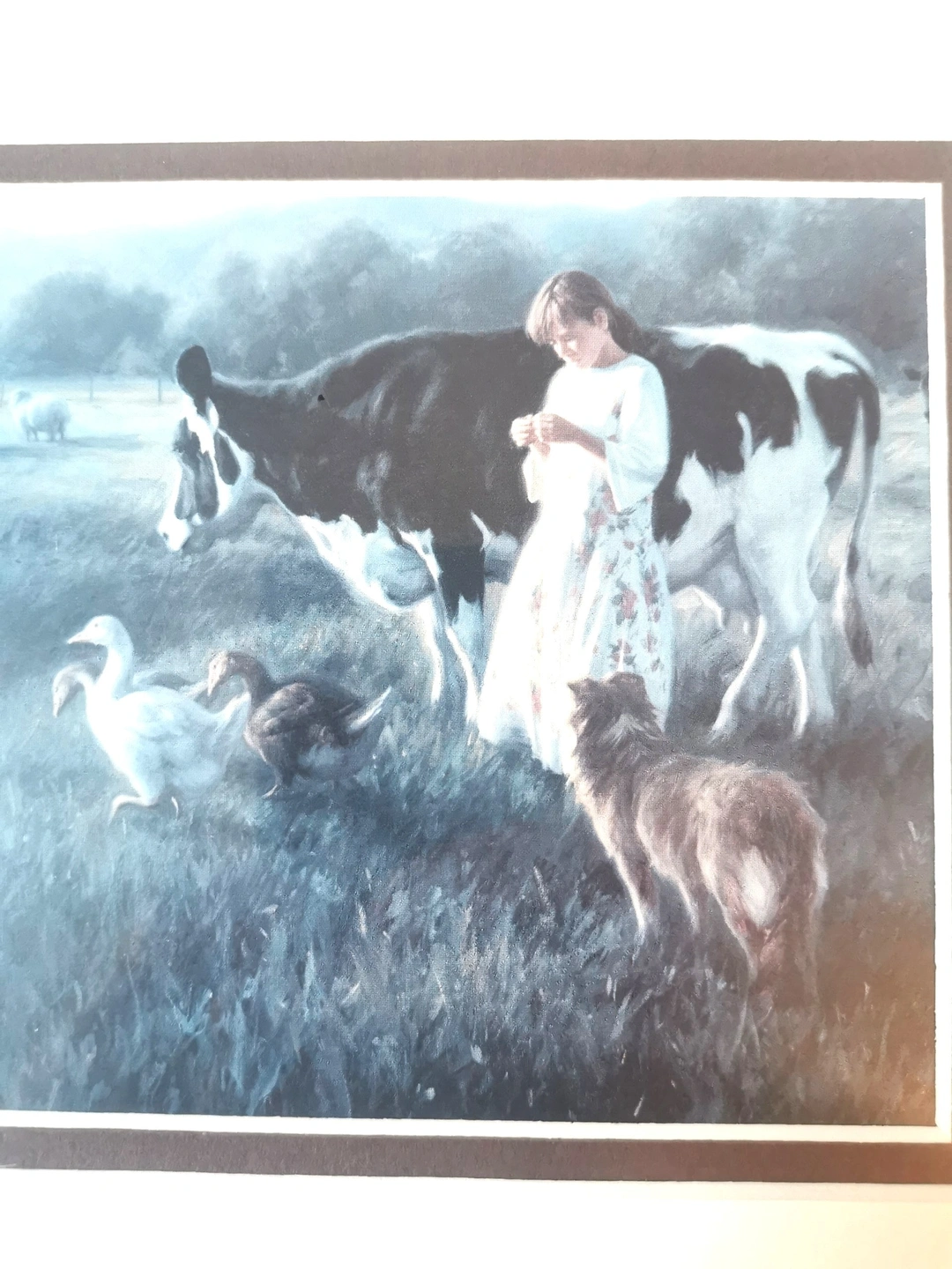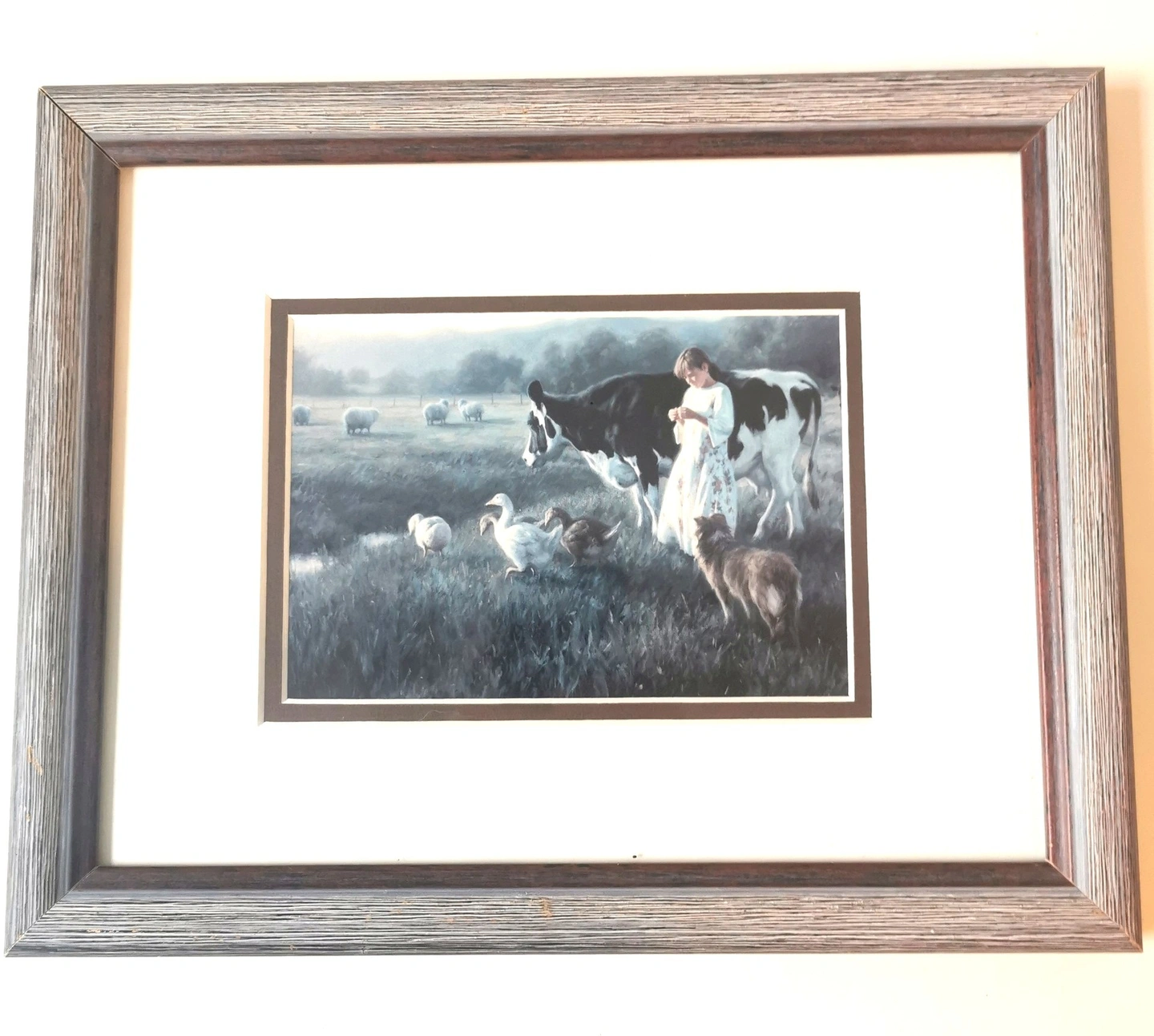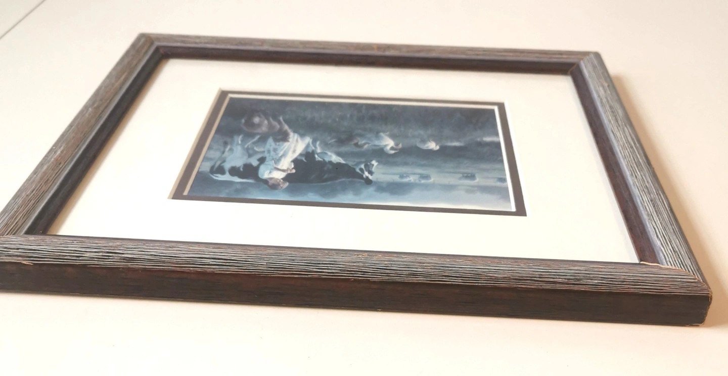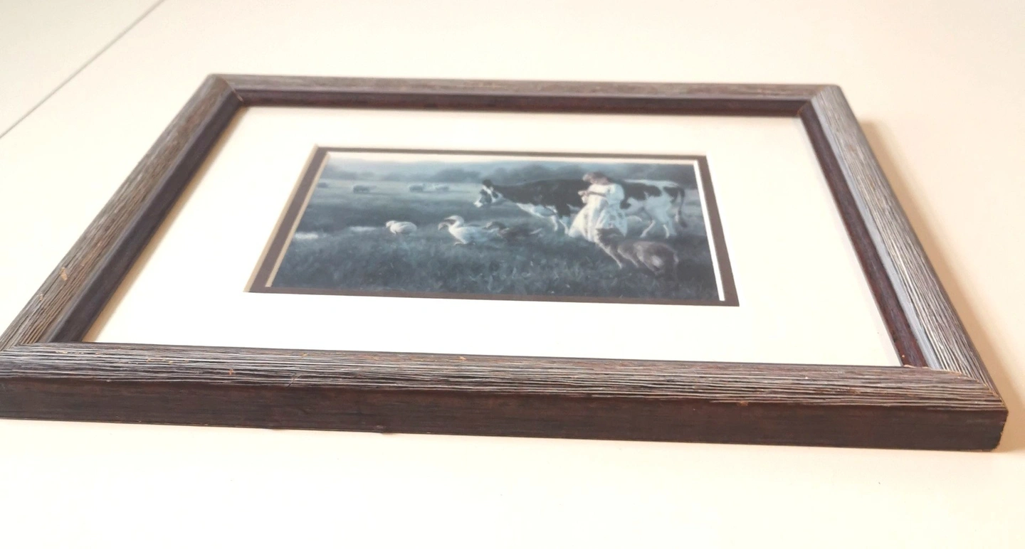 62"Bring the peaceful, nostalgic charm of rural life into your home with this beautiful vintage print by renowned American artist, Robert Duncan." The Artist: Robert Duncan (b. 1952) is celebrated for his detailed and emotionally resonant paintings of country life, the American West, and family. His work has a strong following, making his vintage prints highly desirable. The Artwork: Titled "Out in the Pasture," this print features a delightful, classic farm scene: a young girl tending to a large cow and a group of geese in a lush, open field. The soft colors and idyllic subject matter capture the essence of the Farmhouse and Cottagecore aesthetic. Frame/Display: Housed under glass in its original wood-grain frame, ready to hang. Good vintage condition light wear markings on the rear of the frame please reference photos as they are part of the description of the item. Dimensions: 12.5 inches in length,12.75 inches in width 1 inch in height. Show less