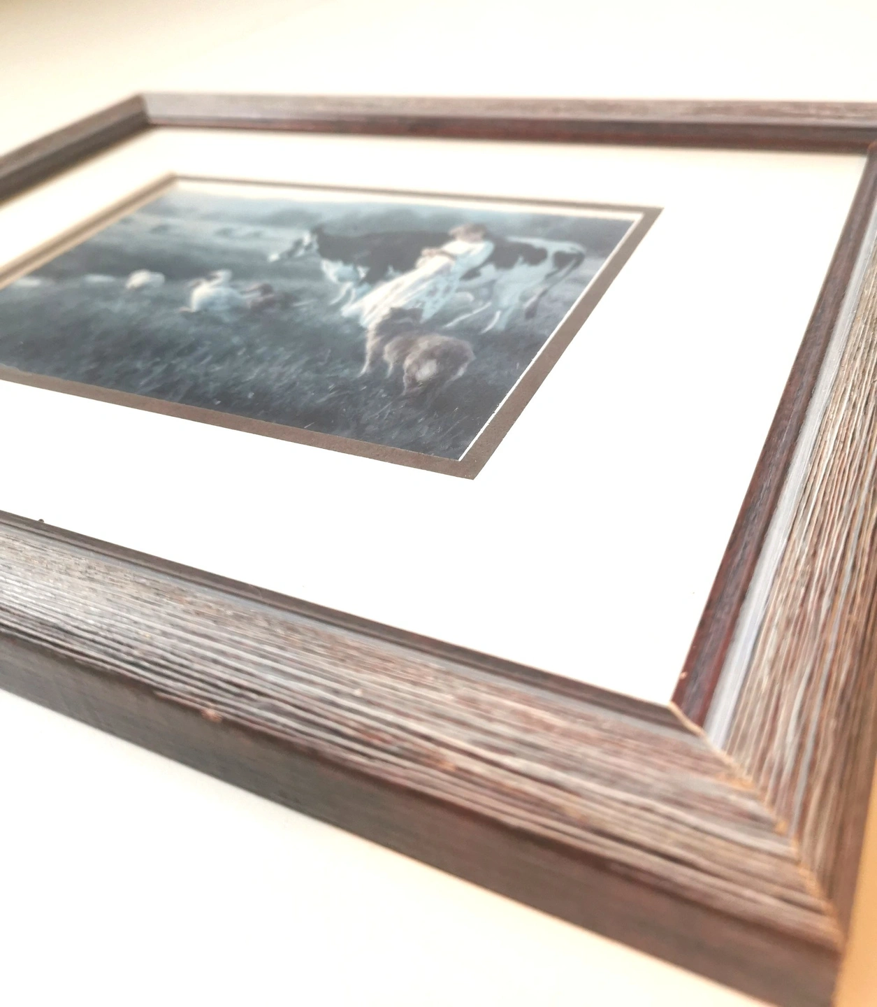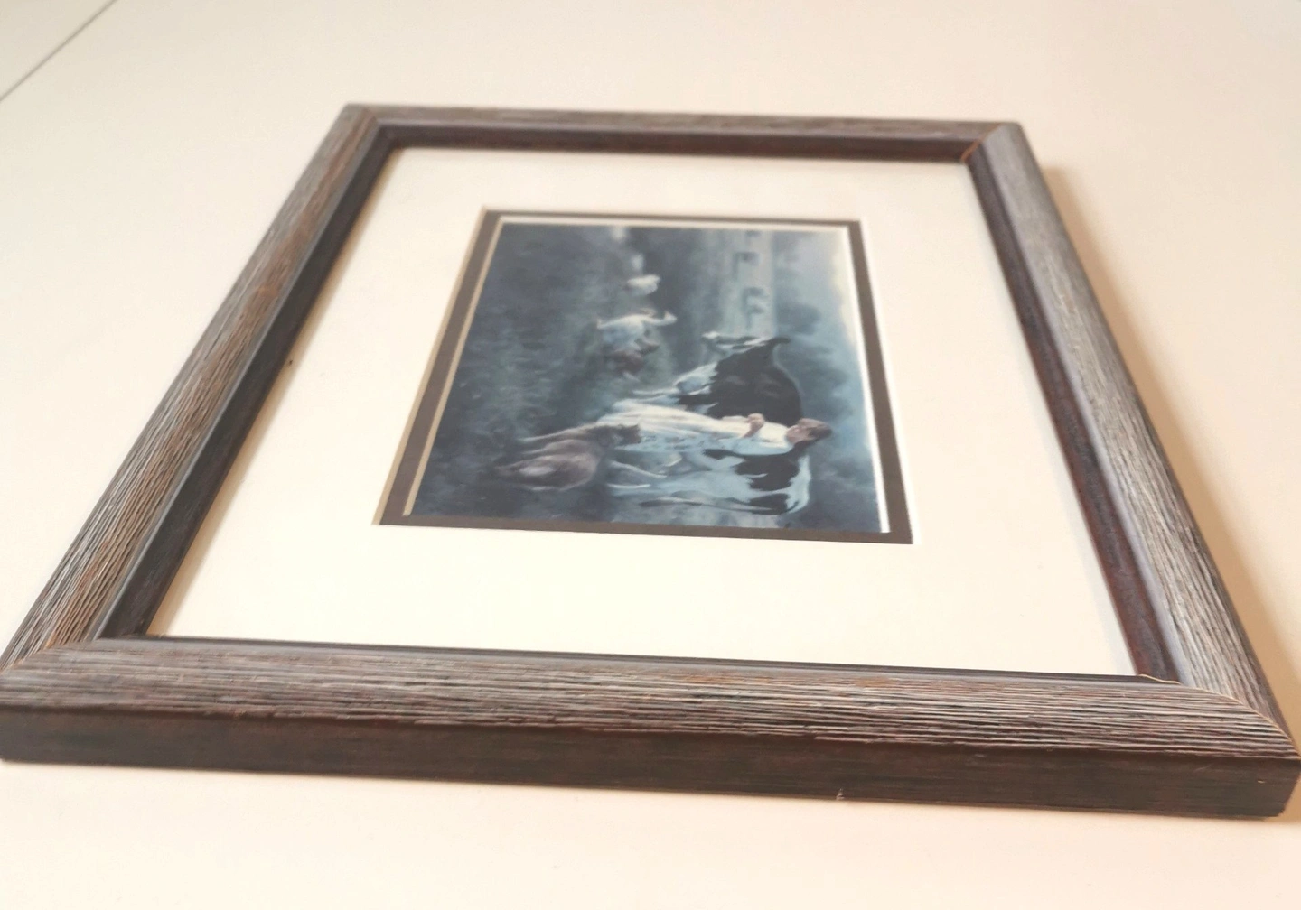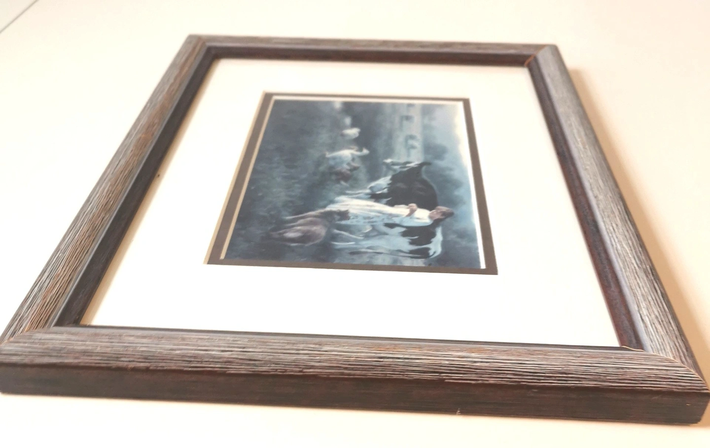 62"Bring the peaceful, nostalgic charm of rural life into your home with this beautiful vintage print by renowned American artist, Robert Duncan." The Artist: Robert Duncan (b. 1952) is celebrated for his detailed and emotionally resonant paintings of country life, the American West, and family. His work has a strong following, making his vintage prints highly desirable. The Artwork: Titled "Out in the Pasture," this print features a delightful, classic farm scene: a young girl tending to a large cow and a group of geese in a lush, open field. The soft colors and idyllic subject matter capture the essence of the Farmhouse and Cottagecore aesthetic. Frame/Display: Housed under glass in its original wood-grain frame, ready to hang. Good vintage condition light wear markings on the rear of the frame please reference photos as they are part of the description of the item. Dimensions: 12.5 inches in length,12.75 inches in width 1 inch in height. Show less