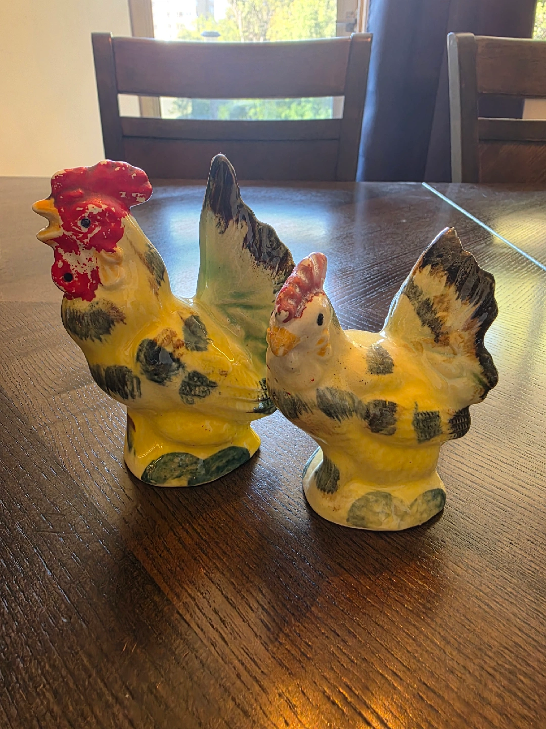 14Vintage Salt & Pepper Shakers. Colorful Hen and Rooster. Made in Japan. cira 1950s-60s. Fun Small Gift for Chicken Lover, Fall Decor. Cork is inside the one Pick up Dawes Road and Danforth area Please see my other ads