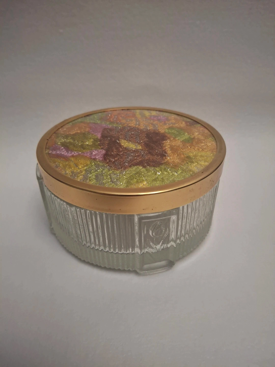 15Here's a lovely vintage round glass trinket box! It has a decorative lid with a gold trim. Perfect for storing small items or adding a touch of vintage charm to your space