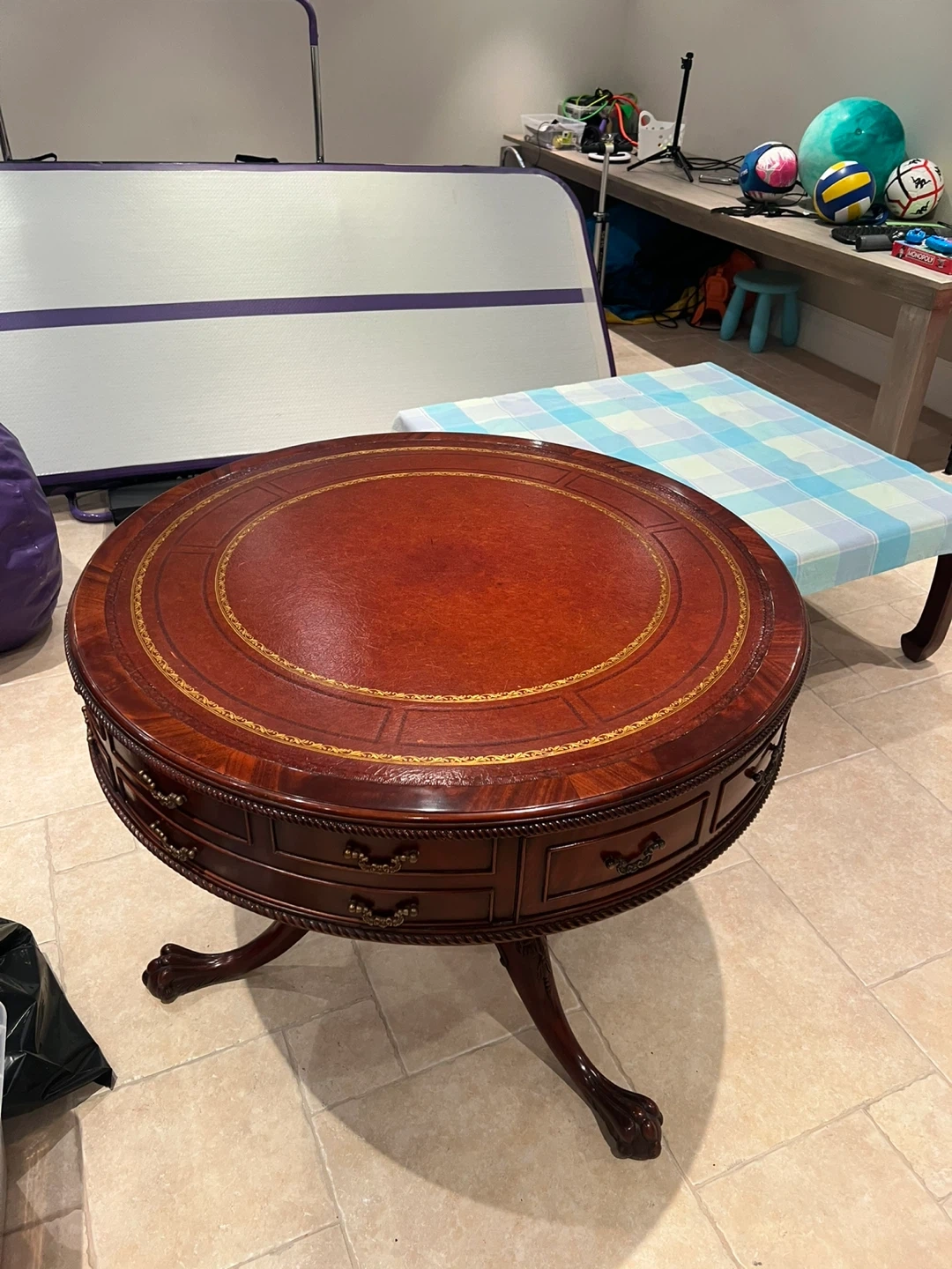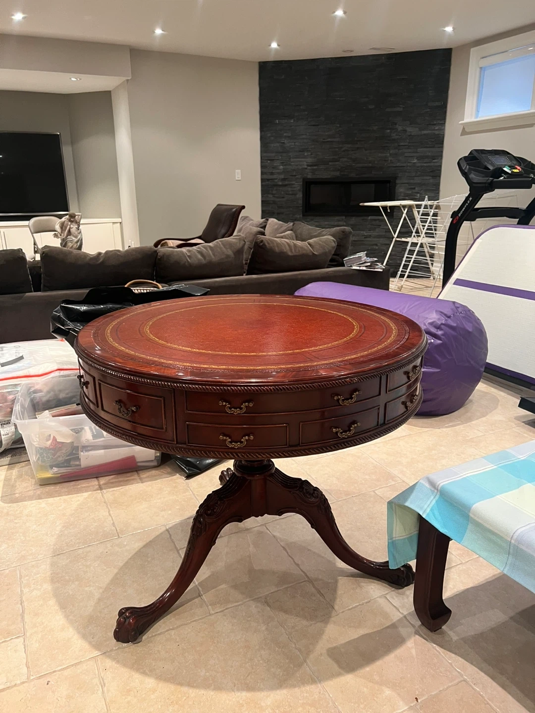 29Beautiful vintage round wood side table with a unique design! It features a rich, warm wood finish and detailed carvings on the legs and drawer fronts. Perfect as a statement piece in any living room or bedroom