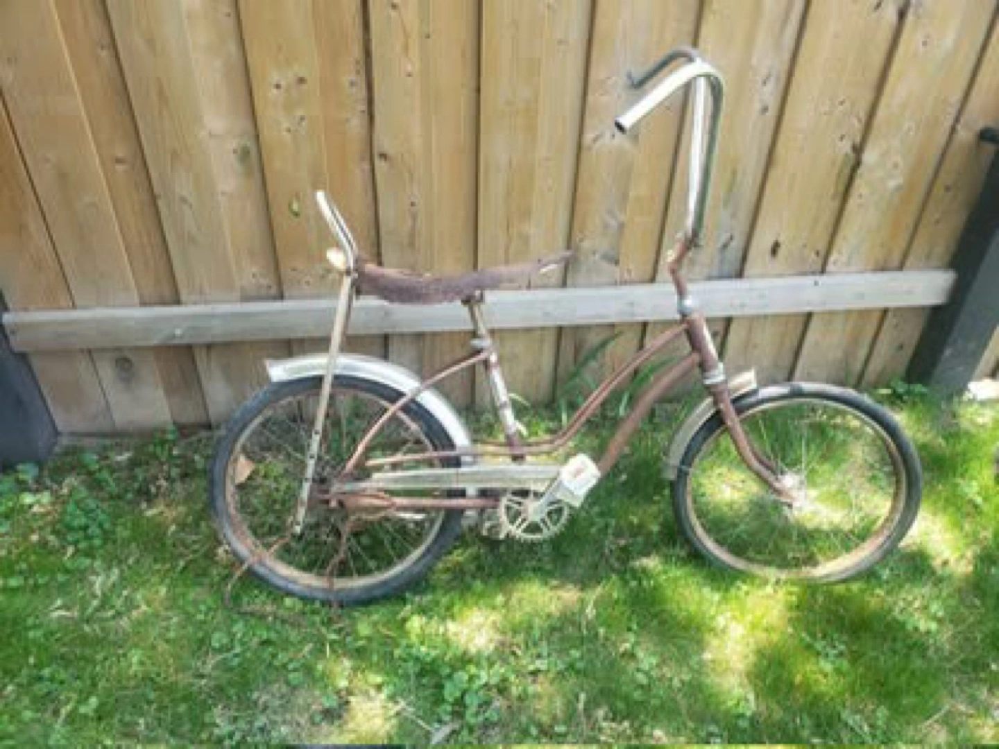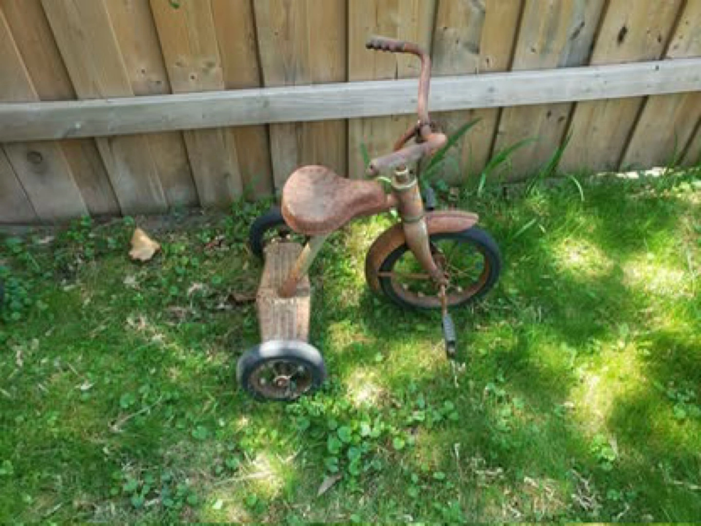 158Two vintage bikes. One is an orange bicycle, the other an orange tricycle.