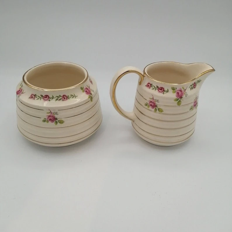 45Selling a lovely vintage Sadler cream and sugar bowl set! It features a delicate floral design with gold trim, perfect for adding a touch of elegance to your tea time. The set is in great condition and ready to be enjoyed in a new home