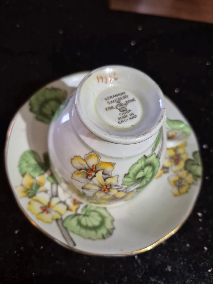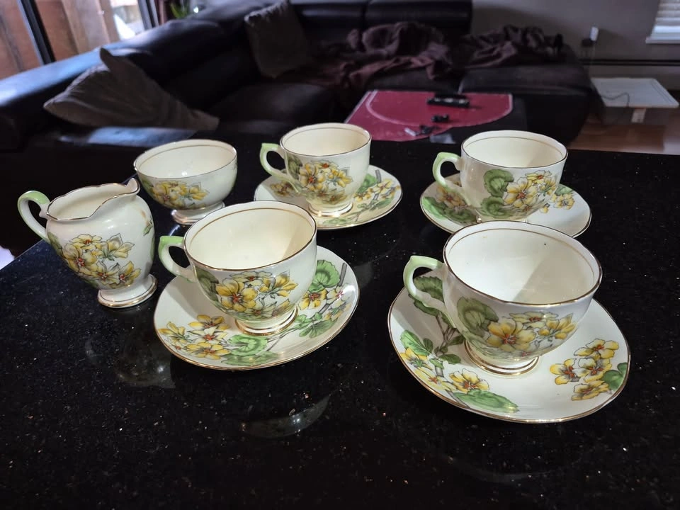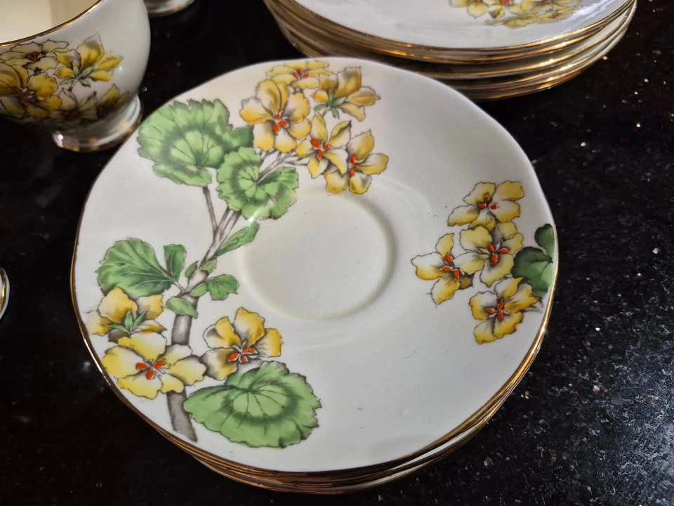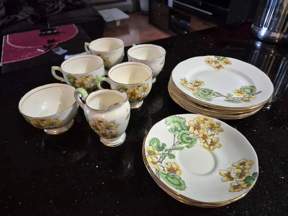 75Vintage Salisbury Fine Bone China Tea Cups, Saucers, Plates with Creamer and Sugar Bowl Set ~ 17 Pieces ~ Geranium Pattern - $170 17 pieces in total 4 Cups 1 Milk / Creamer 1 Sugar Bowl 5 Saucers 6 Plates Beautiful set of four bone china tea cups & saucers and a milker/creamer made by Salisbury China of England. As per the back stamps, the pattern name is Geranium. The set has a white base and is adorned with hand tinted yellow Geraniums and bright green leaves. All pieces are in very good condition ~ no chips, no cracks, no wear, minor crazing. NOTE: I found the same set / pattern online and it was mentioned they are from the 1930’s but I’m not sure if that is correct. I would have guessed the 40s or 50s. Measurements Cups: 6.7 cm / 2.75" tall x 8 cm / 3.125" diameter Milk / Creamer: 9 cm / 3.5" tall Sugar Bowl: 9 cm / 3.5’ diameter x 5.5 cm / 2.25” tall Saucers: 13.5 cm / 5.25" diameter Plates: 17.5 cm / 7" diameter Availability & Payment: If you see this post, it's available — don't hesitate to reach out! Cash only, please. No e-transfers. More to Browse: Moving out of the country and selling everything I own — check out my other listings for furniture, electronics, sporting gear, kitchenware, collectibles, and plenty more!