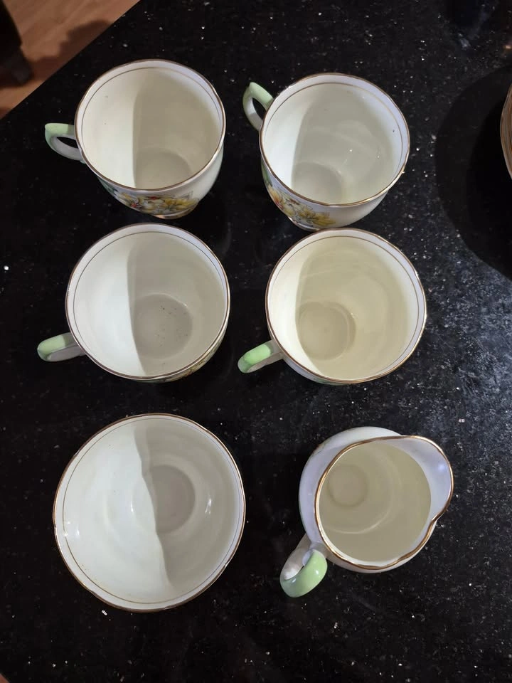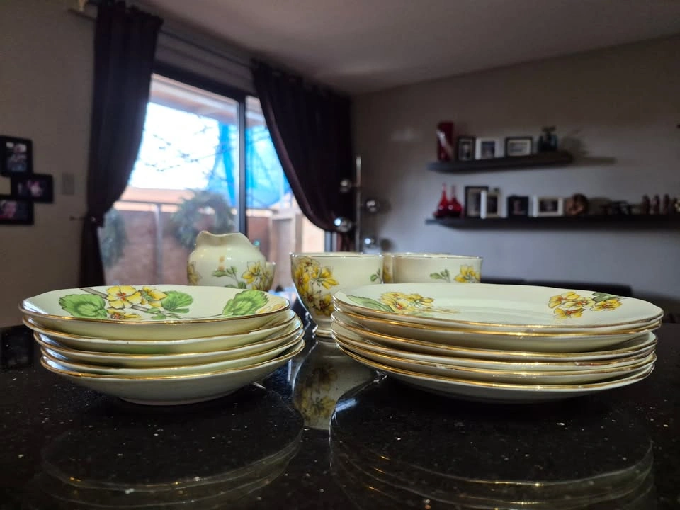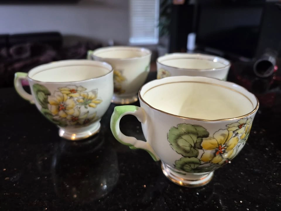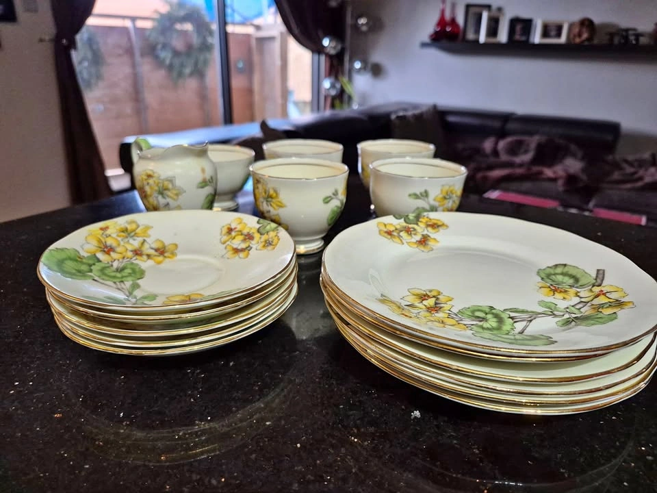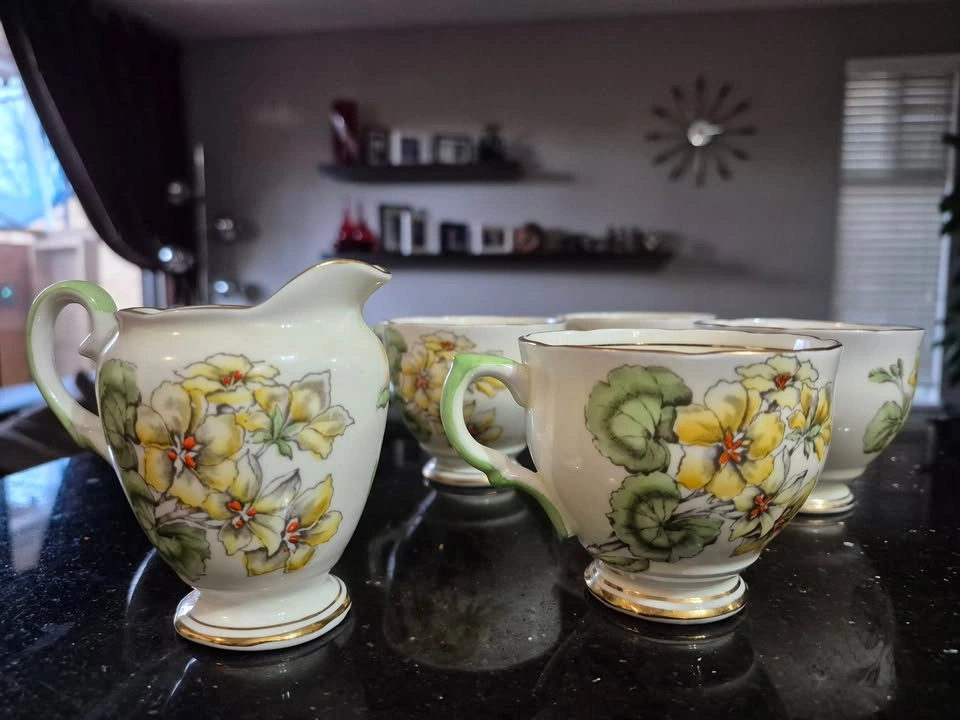 75Vintage Salisbury Fine Bone China Tea Cups, Saucers, Plates with Creamer and Sugar Bowl Set ~ 17 Pieces ~ Geranium Pattern - $170 17 pieces in total 4 Cups 1 Milk / Creamer 1 Sugar Bowl 5 Saucers 6 Plates Beautiful set of four bone china tea cups & saucers and a milker/creamer made by Salisbury China of England. As per the back stamps, the pattern name is Geranium. The set has a white base and is adorned with hand tinted yellow Geraniums and bright green leaves. All pieces are in very good condition ~ no chips, no cracks, no wear, minor crazing. NOTE: I found the same set / pattern online and it was mentioned they are from the 1930’s but I’m not sure if that is correct. I would have guessed the 40s or 50s. Measurements Cups: 6.7 cm / 2.75" tall x 8 cm / 3.125" diameter Milk / Creamer: 9 cm / 3.5" tall Sugar Bowl: 9 cm / 3.5’ diameter x 5.5 cm / 2.25” tall Saucers: 13.5 cm / 5.25" diameter Plates: 17.5 cm / 7" diameter Availability & Payment: If you see this post, it's available — don't hesitate to reach out! Cash only, please. No e-transfers. More to Browse: Moving out of the country and selling everything I own — check out my other listings for furniture, electronics, sporting gear, kitchenware, collectibles, and plenty more!