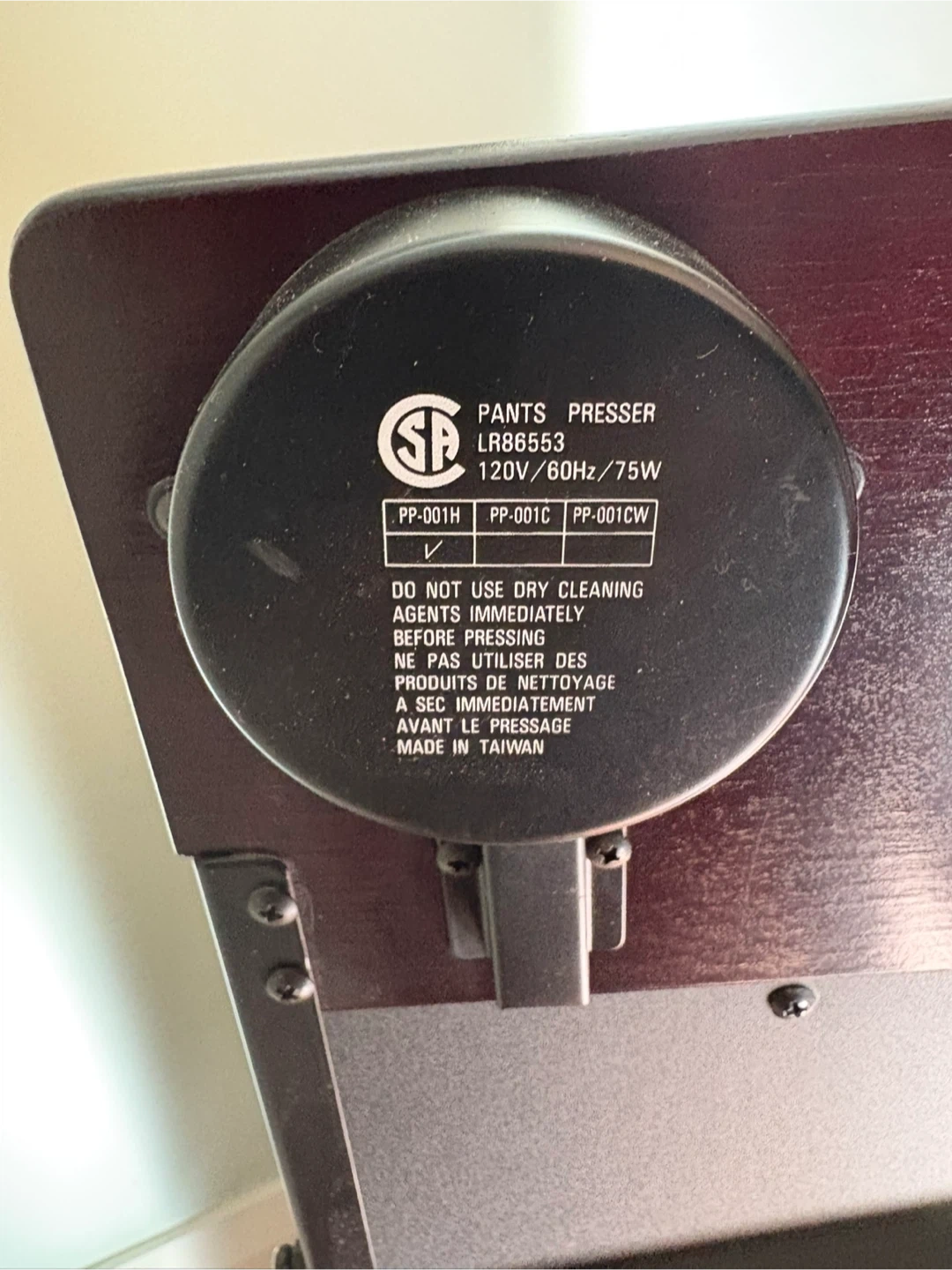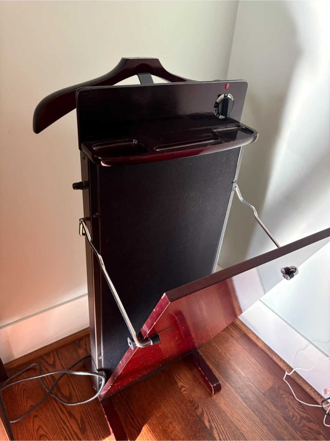 87Keep your wardrobe crisp and ready with this elegant Salton electric pants presser and valet stand. Beautifully crafted in rich wood, it combines timeless style with practical function — perfect for anyone who values a neat, organized look. Features: • Built-in electric pants presser – works perfectly • All-wood construction with a classic cherry finish • Jacket hanger with contoured shoulders • Extendable tie and belt rod • Top shelf for wallet, watch, cufflinks, or other essentials • Automatic timer control with indicator light • Solid and stable base Ideal for bedrooms, dressing areas, or professional spaces. A refined addition that keeps your clothes looking freshly pressed and ready to wear. Condition: Excellent vintage condition. Fully functional and clean. Minor signs of normal use consistent with age.