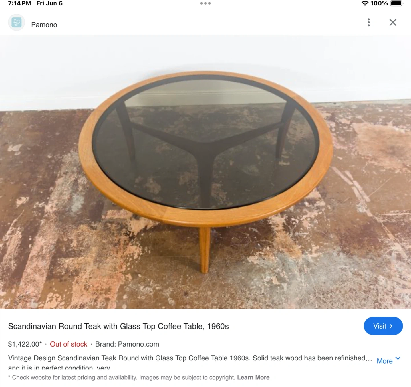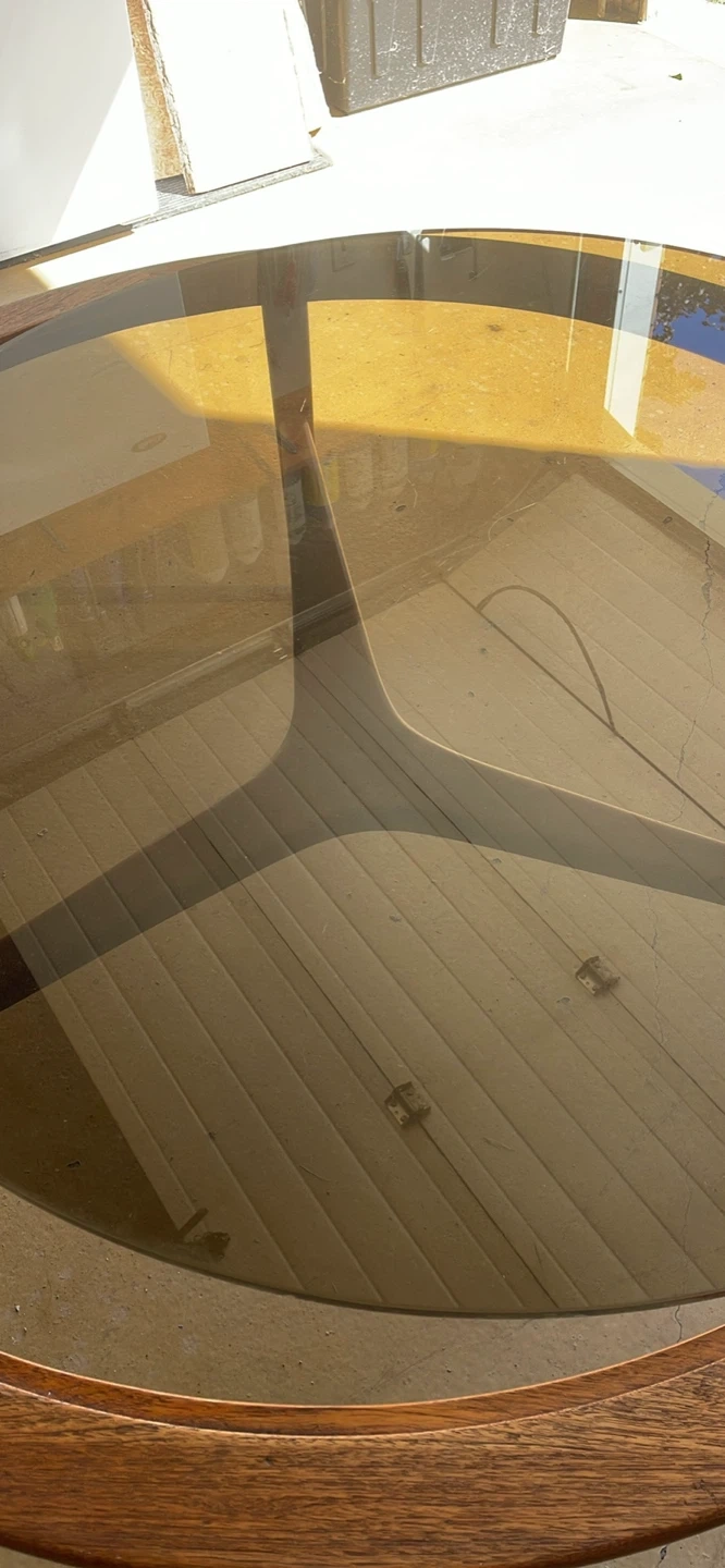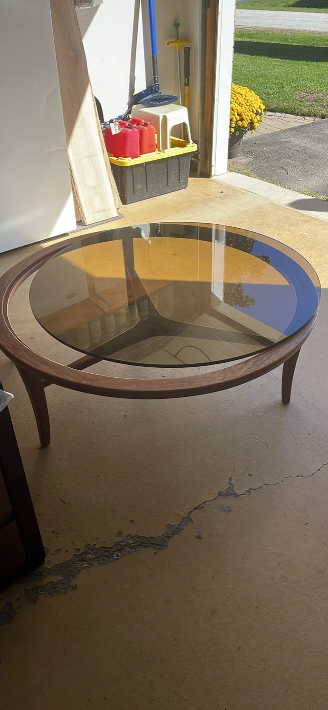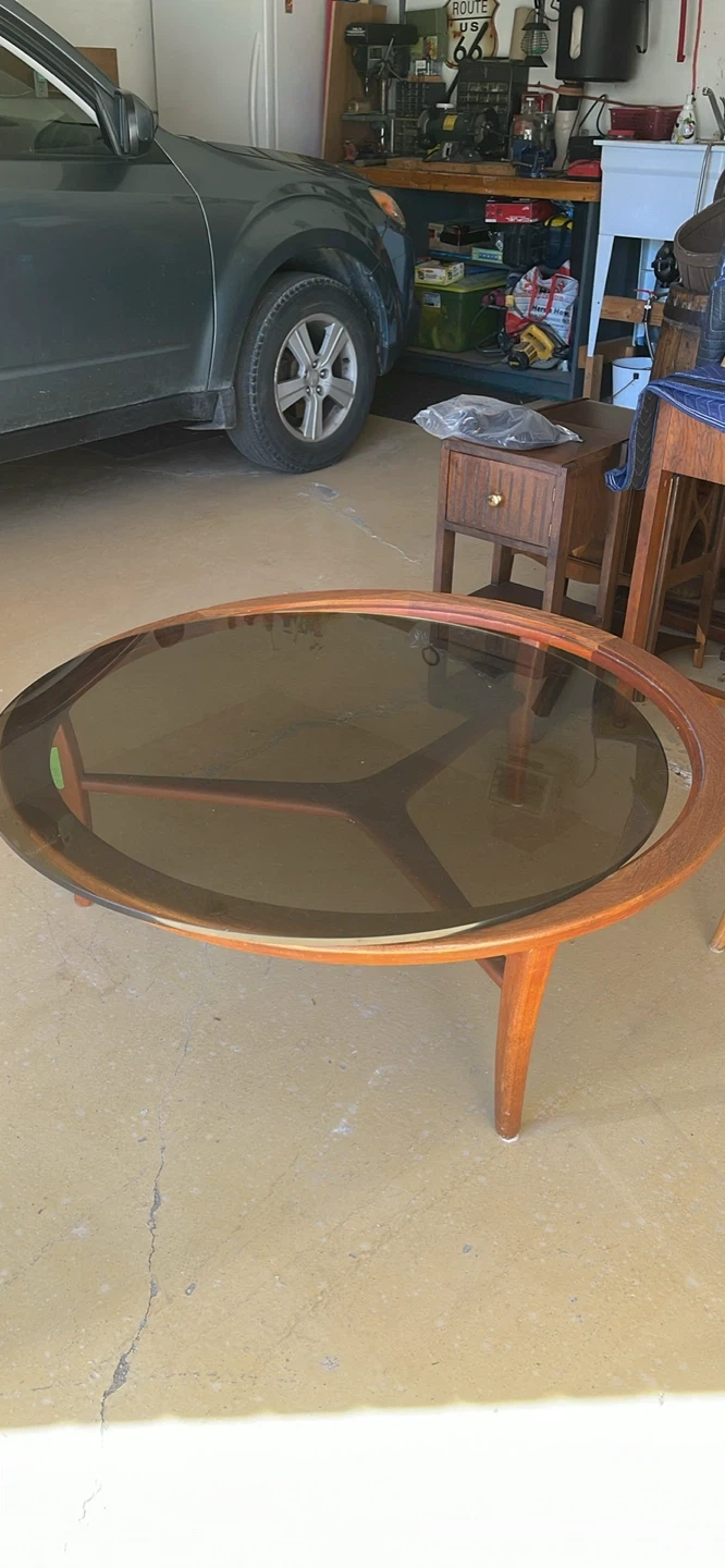 Selling a beautiful vintage Scandinavian coffee table! It features a round teak frame with a glass top and a unique three-legged base. This table would be a great addition to any living room or den, adding a touch of mid-century modern style to your home. Also known as the Mercedes table.