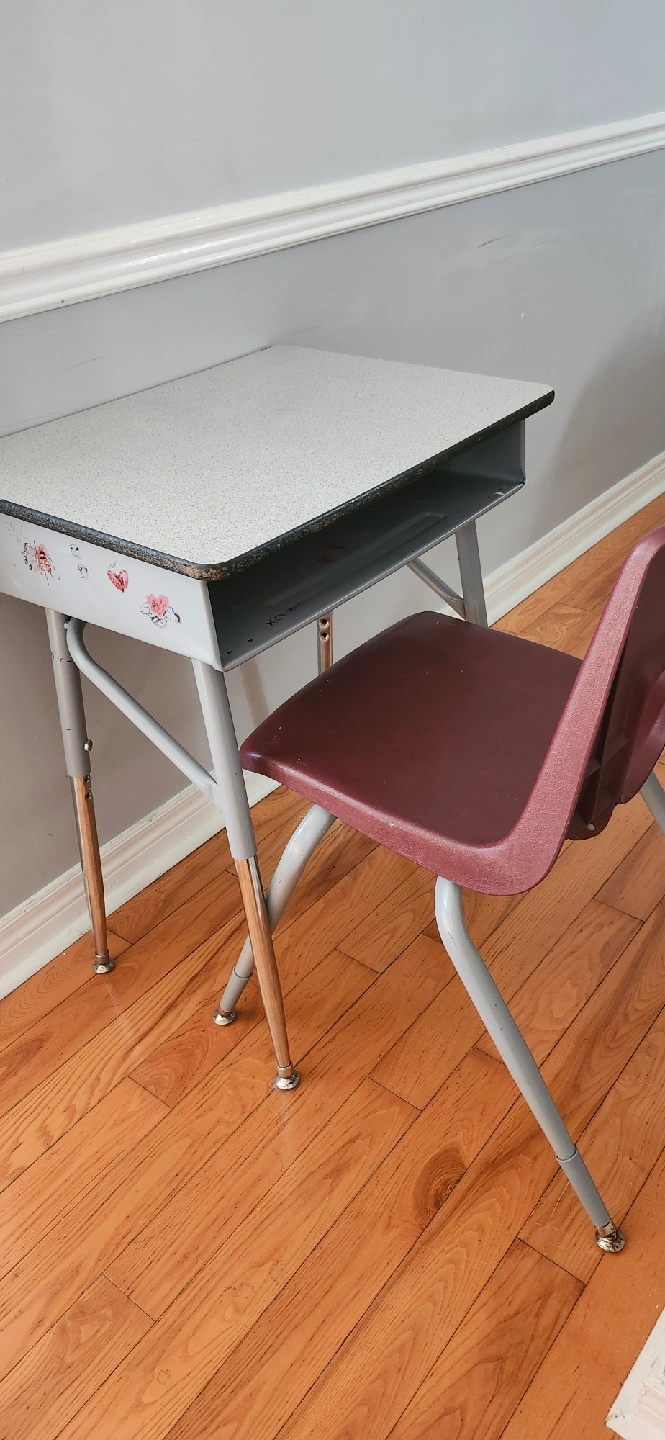 Selling a vintage school desk and chair set. The desk has a speckled white top and a grey metal frame with some cute floral decals. The chair is a maroon colour with a metal frame as well. Perfect for a student or anyone who loves retro furniture!