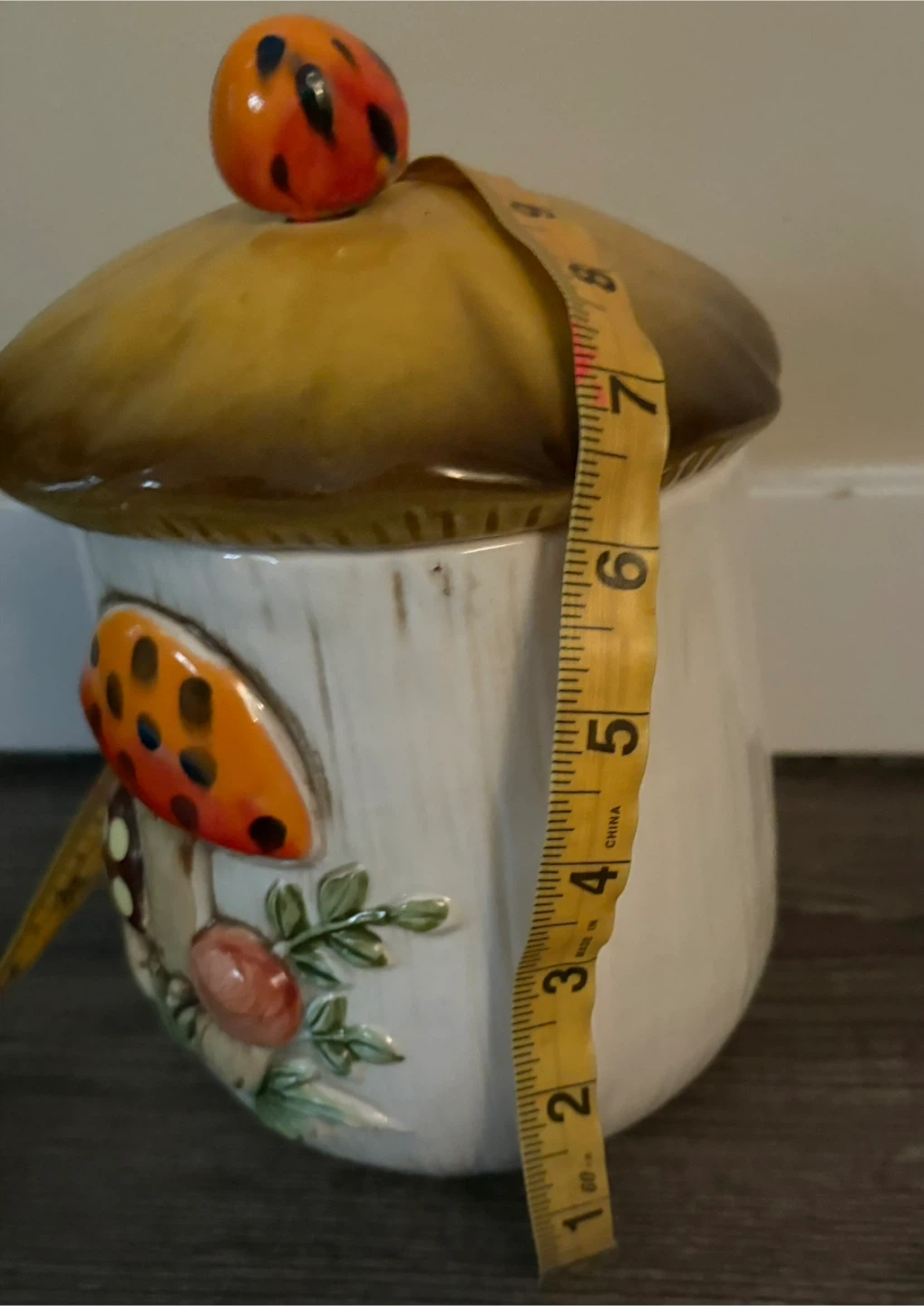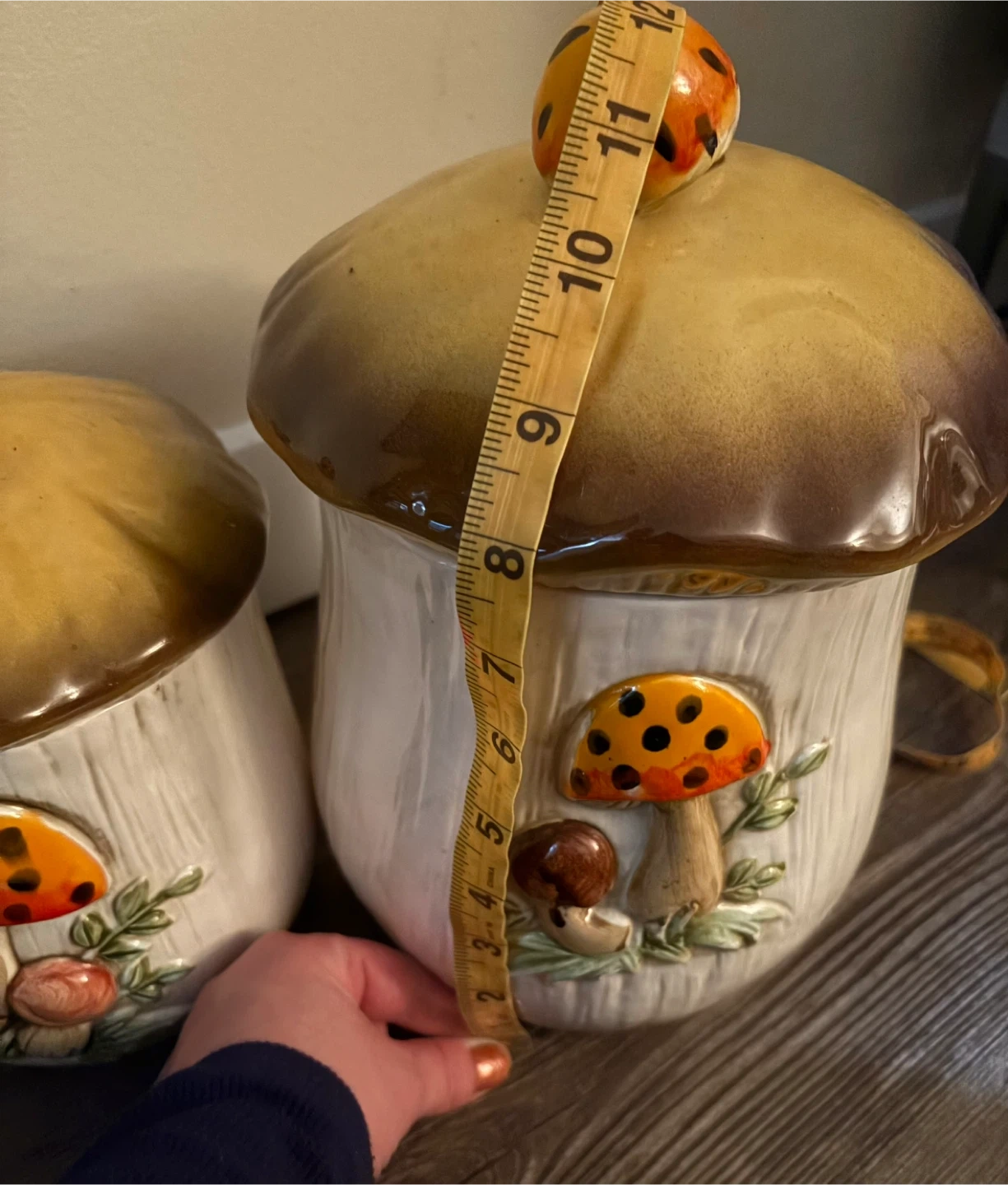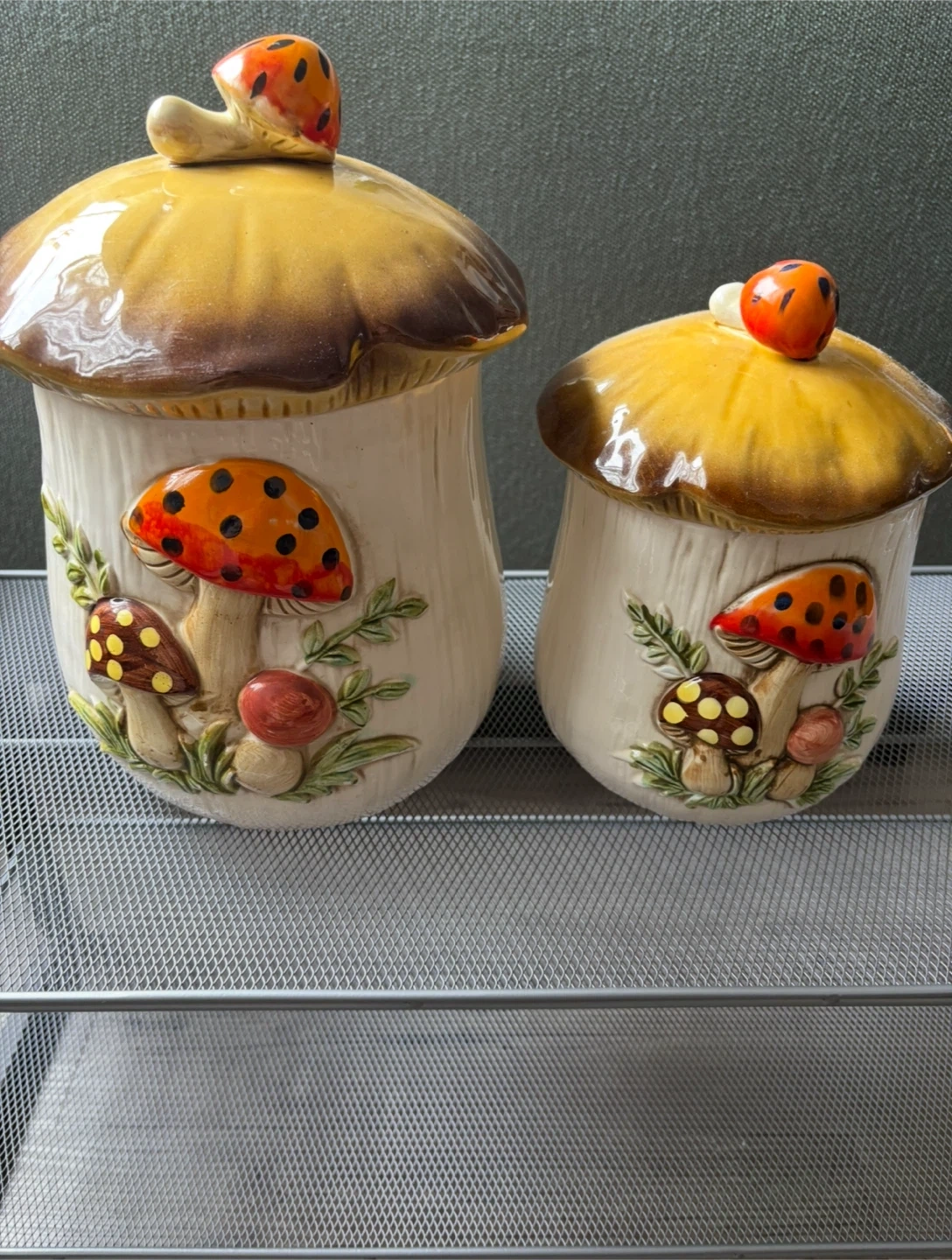 Whimsical ceramic canisters with mushroom motifs. L & XL canisters. Both have some minor chips around the rim, but they are still structurally sound.