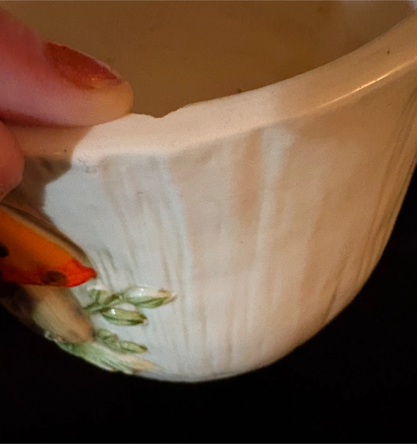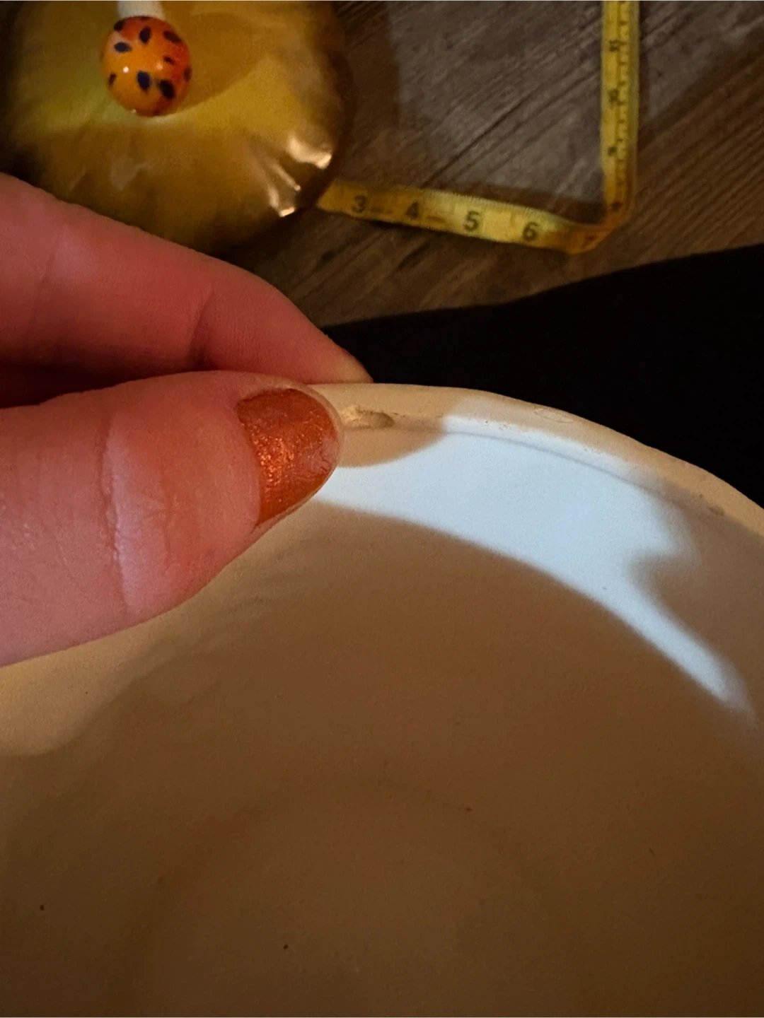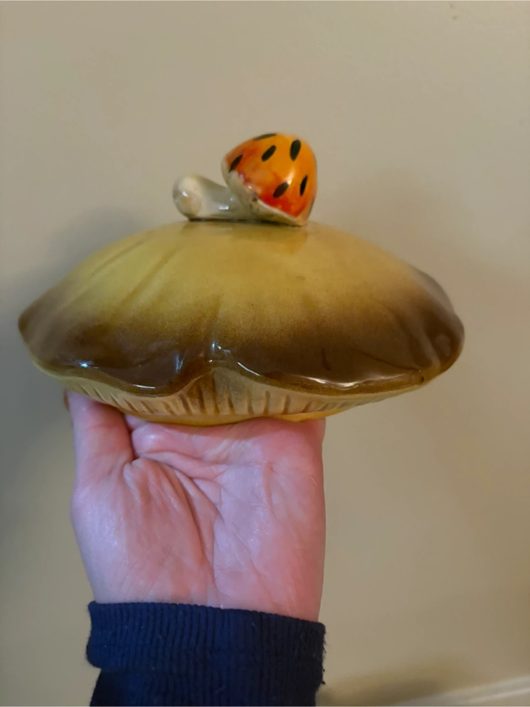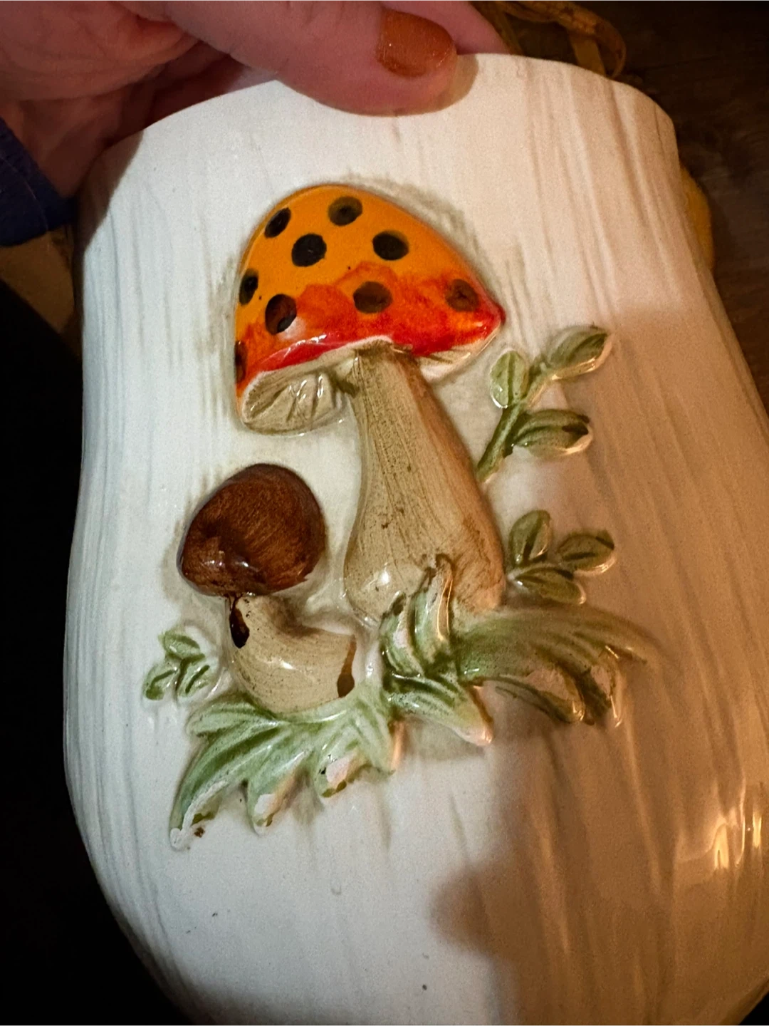 Whimsical ceramic canisters with mushroom motifs. L & XL canisters. Both have some minor chips around the rim, but they are still structurally sound.
