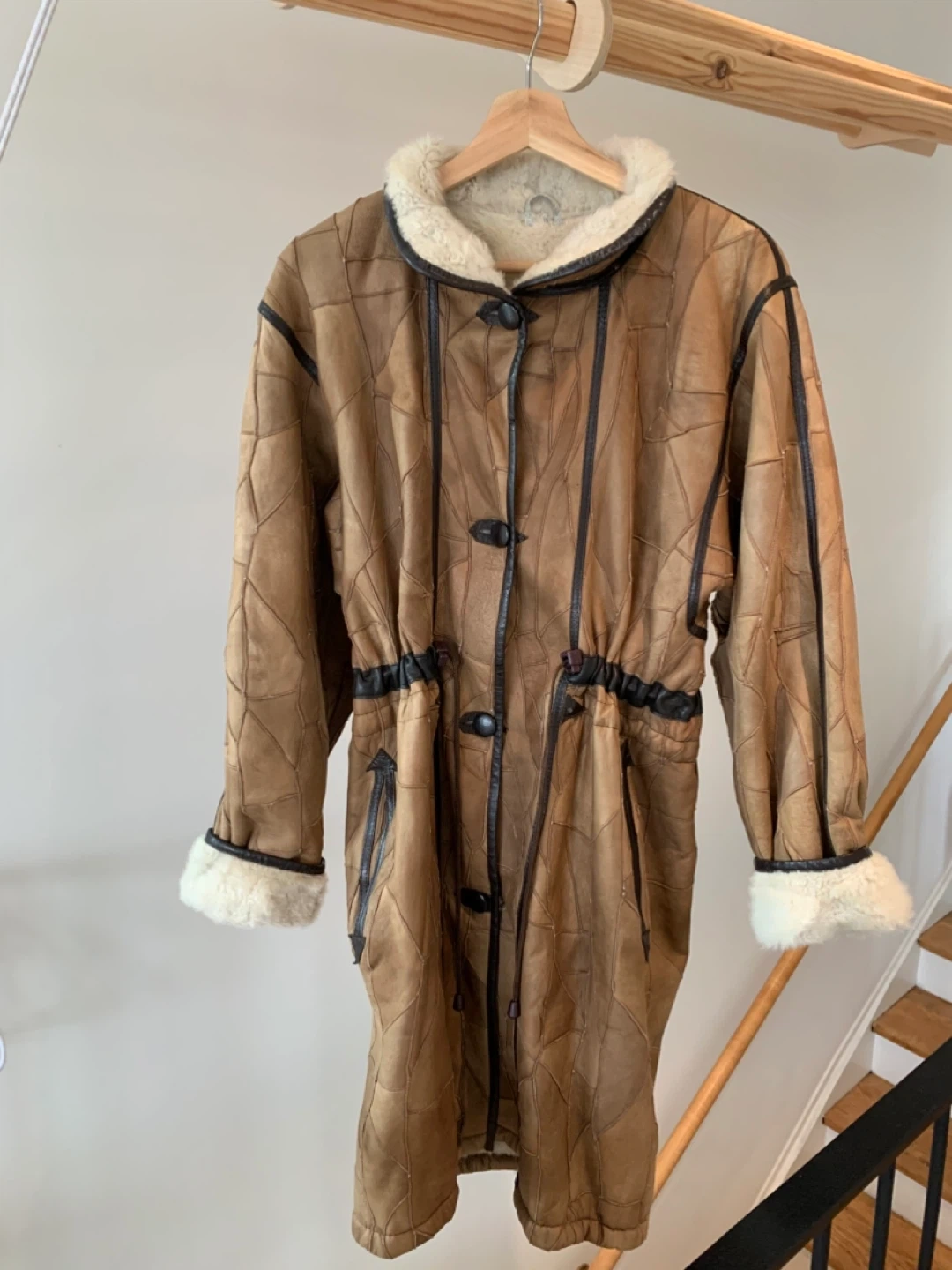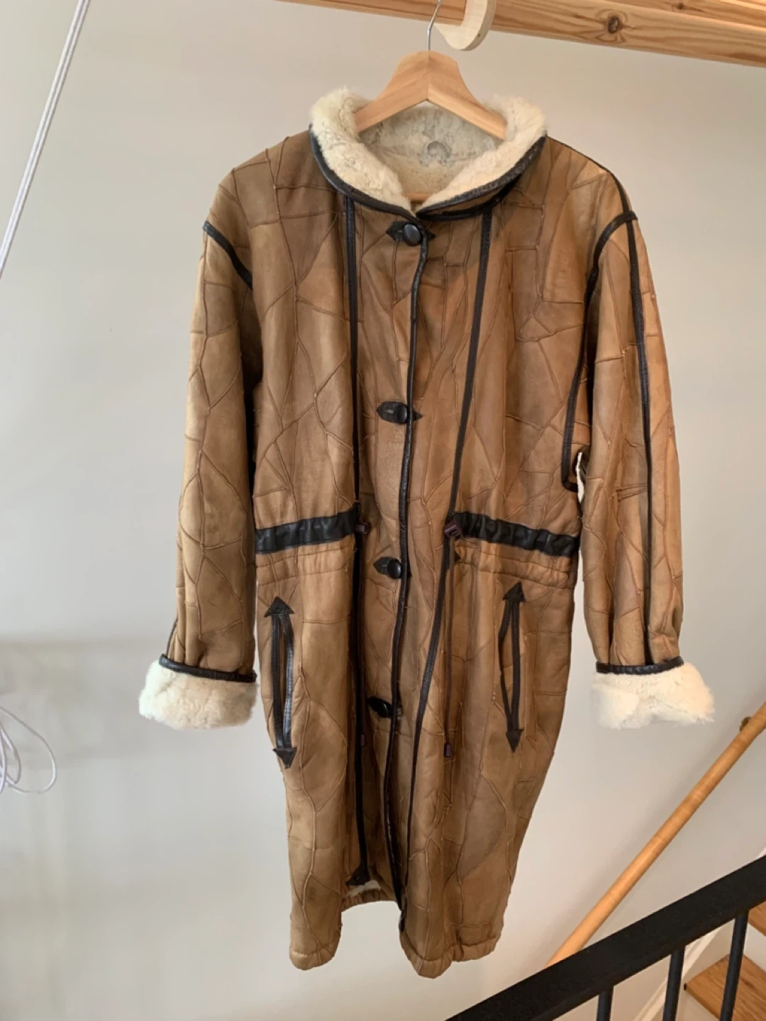 58Selling a vintage shearling coat with a unique patchwork design. A stylish piece in overall good condition. Some repair required to bottom button closure, please see pictures for detail. No label, originally purchased from a retailer in Lithuania. Would describe it as a roomy size medium. Features large pockets and a drawstring waist. Appropriate for Fall or as a light Winter coat. No scent, and had been kept in a clean and smoke free environment. Pick up around Keele and Dundas.